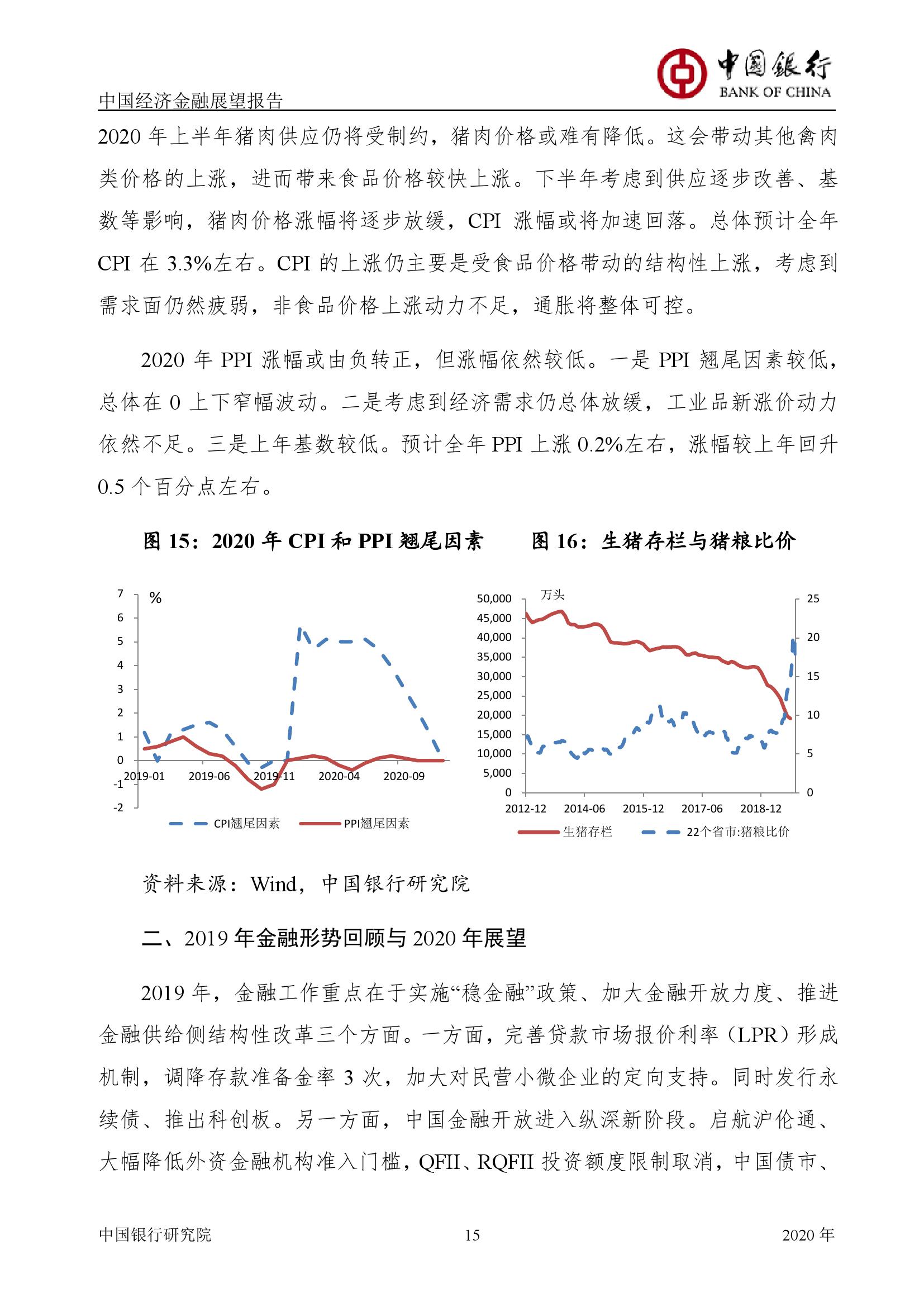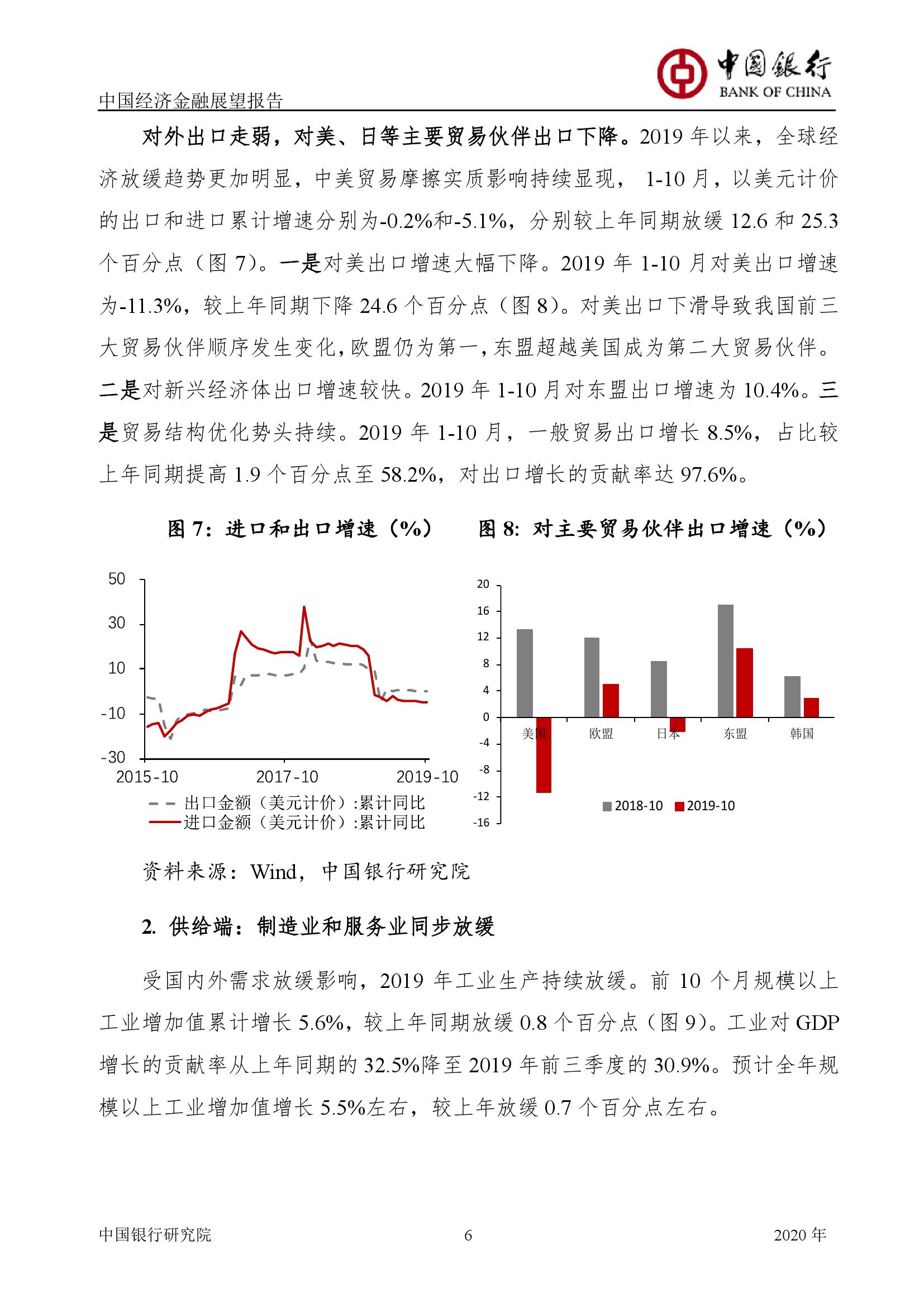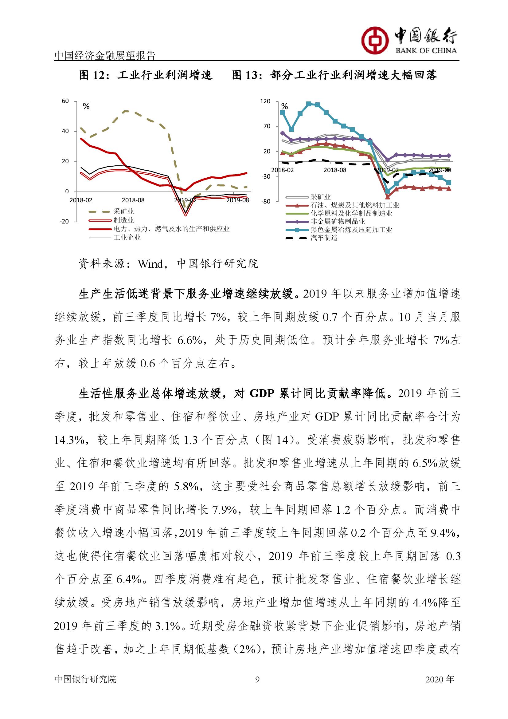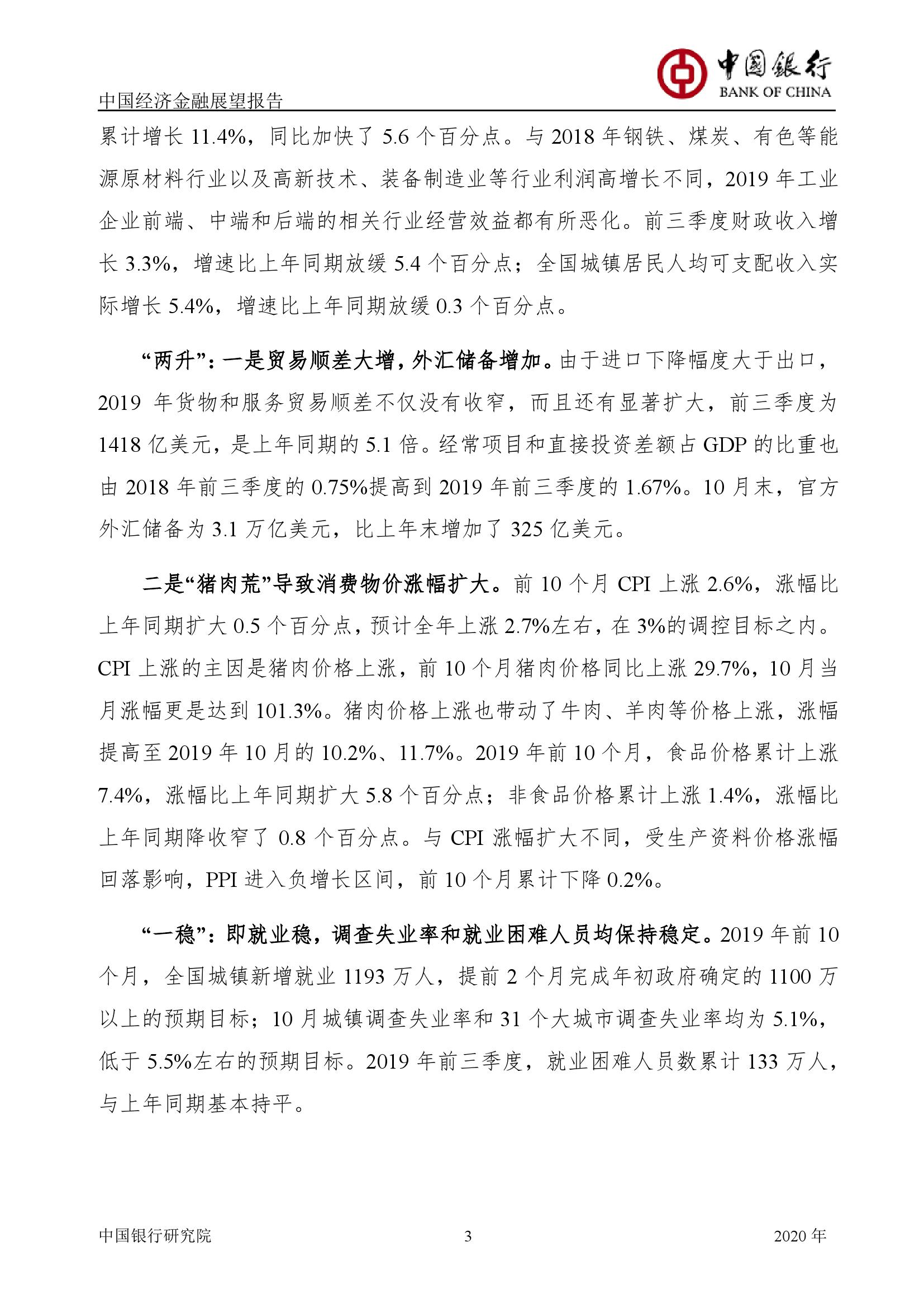 中国经济金融主要面临中美贸易摩擦、猪肉价格上涨、实体经济需求低迷、债券违约风险或向信贷市场传导等风险。展望2020年,中国经济面临的风险和挑战增多,总体判断“谨慎乐观”。按当前内外部市场环境,若政策不做大的调整,2020年中国经济自然增长率很可能会低于6%。