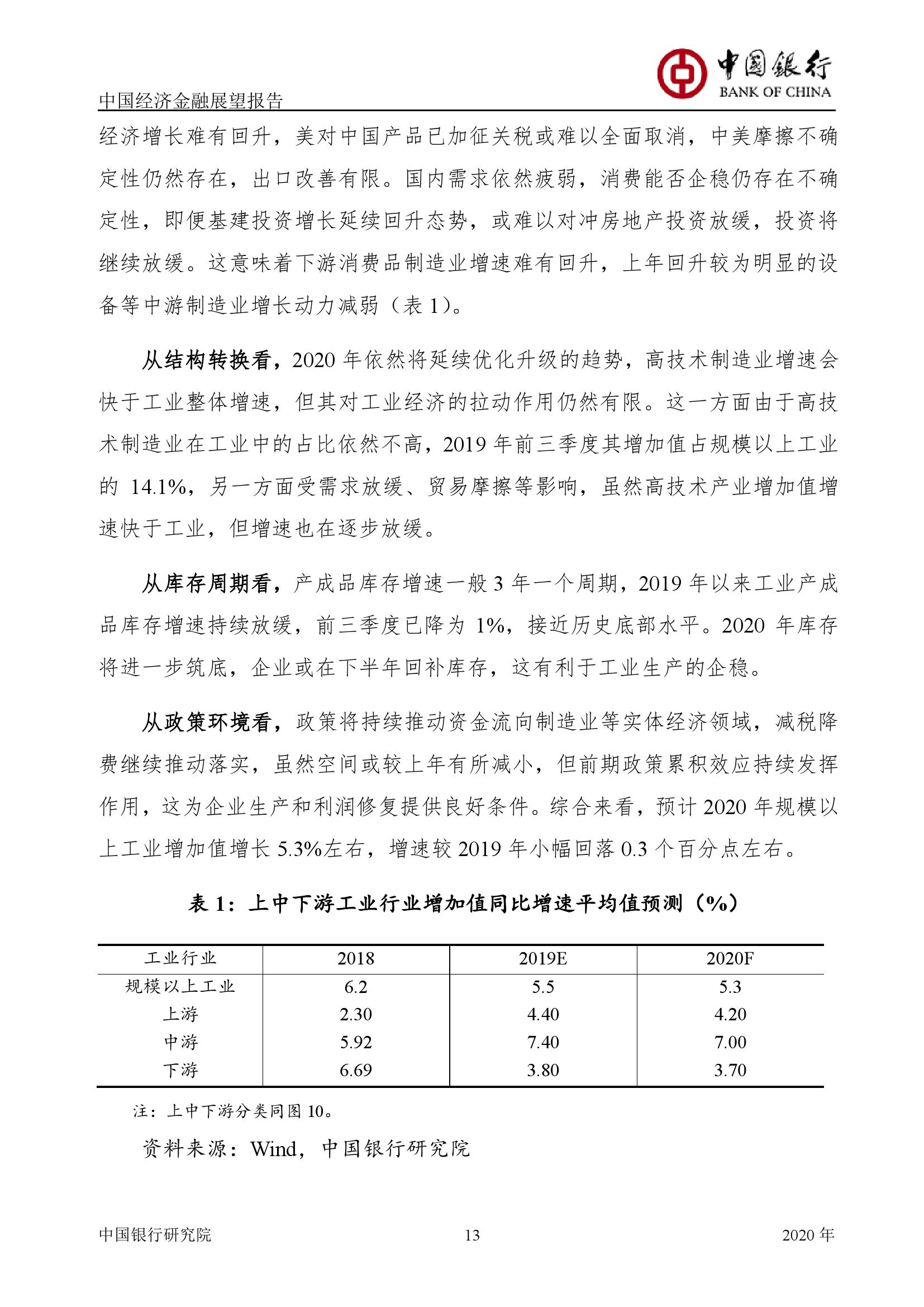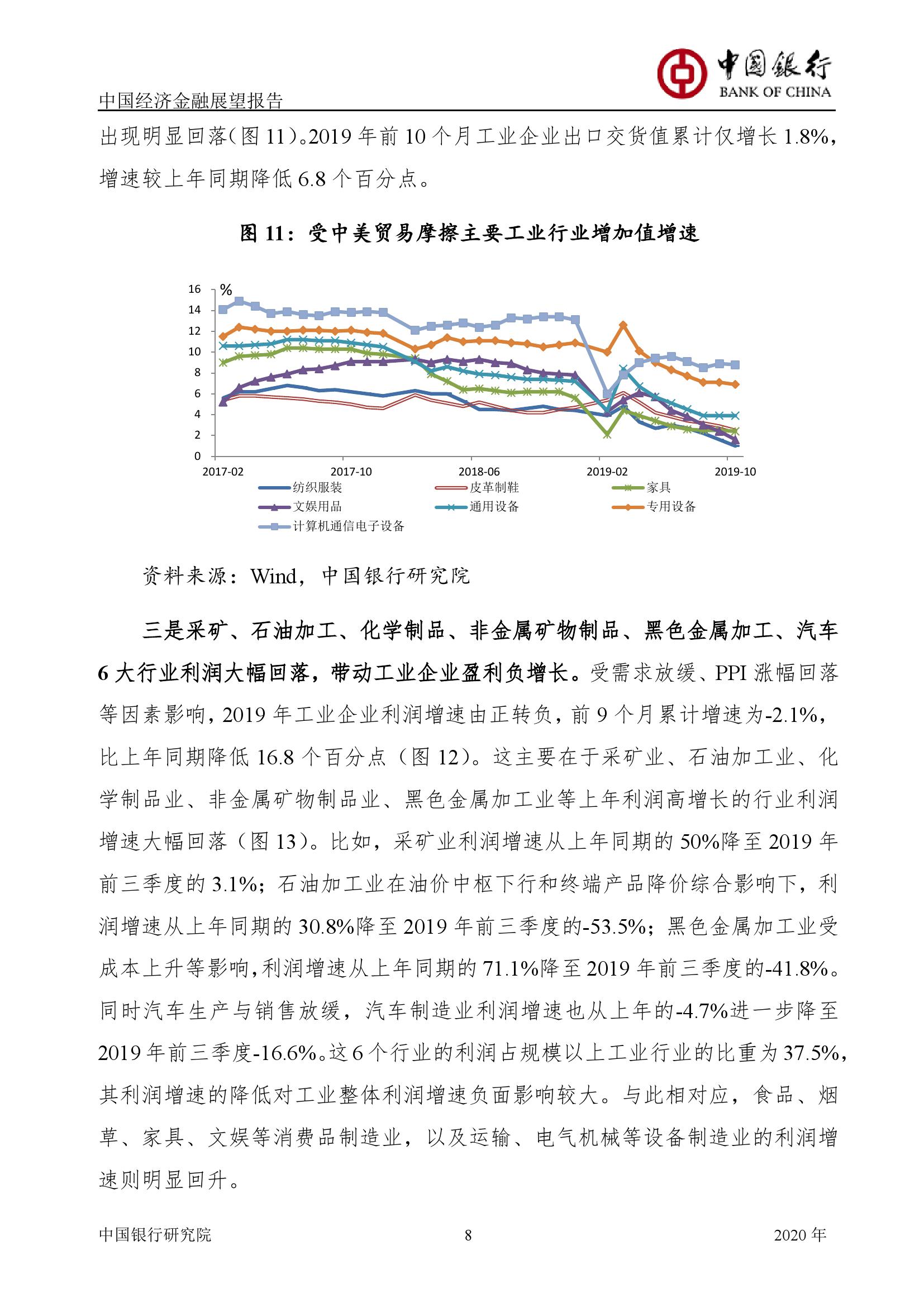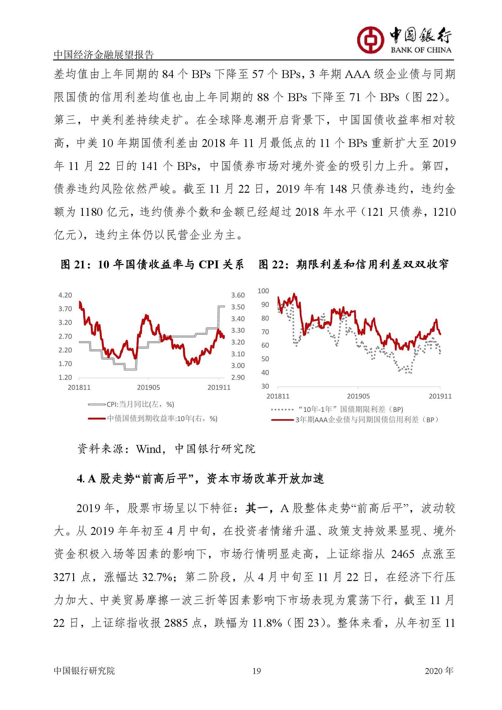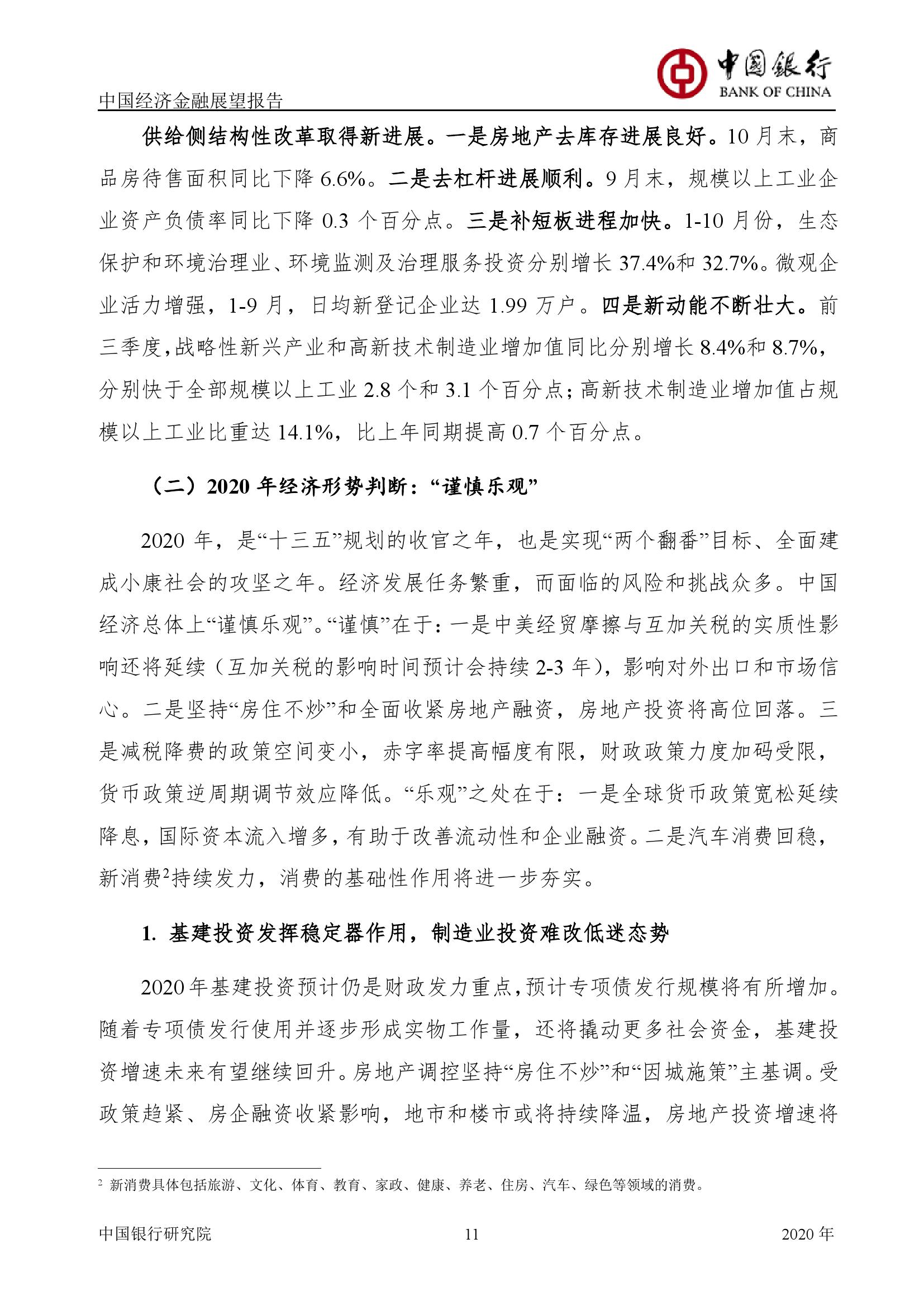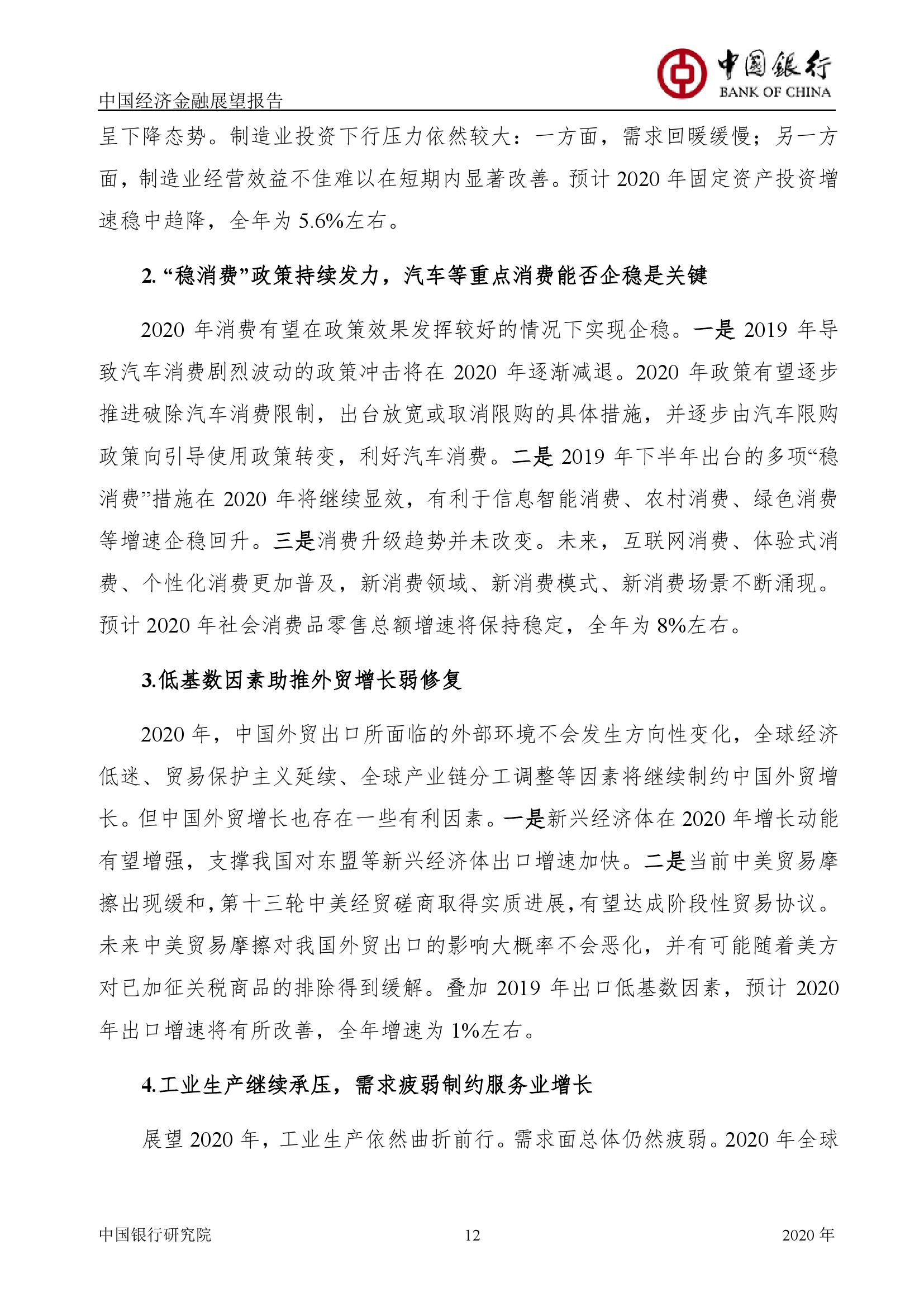中国经济金融主要面临中美贸易摩擦、猪肉价格上涨、实体经济需求低迷、债券违约风险或向信贷市场传导等风险。展望2020年,中国经济面临的风险和挑战增多,总体判断“谨慎乐观”。按当前内外部市场环境,若政策不做大的调整,2020年中国经济自然增长率很可能会低于6%。
