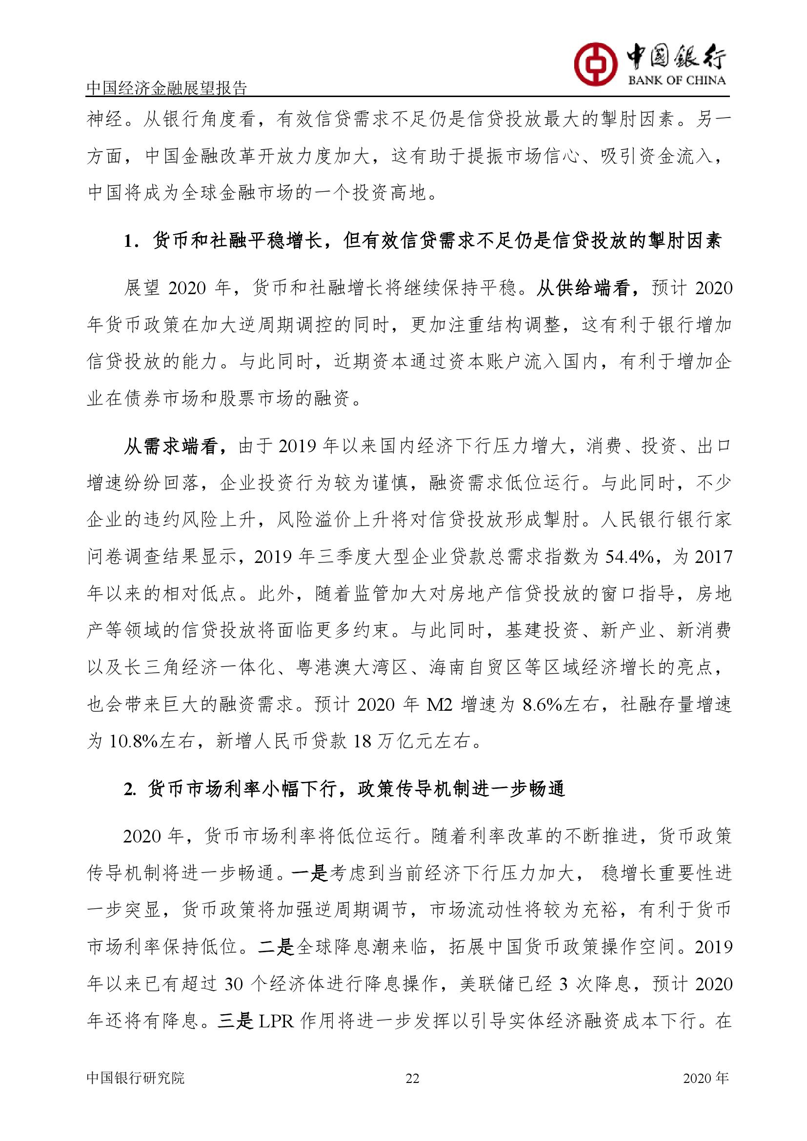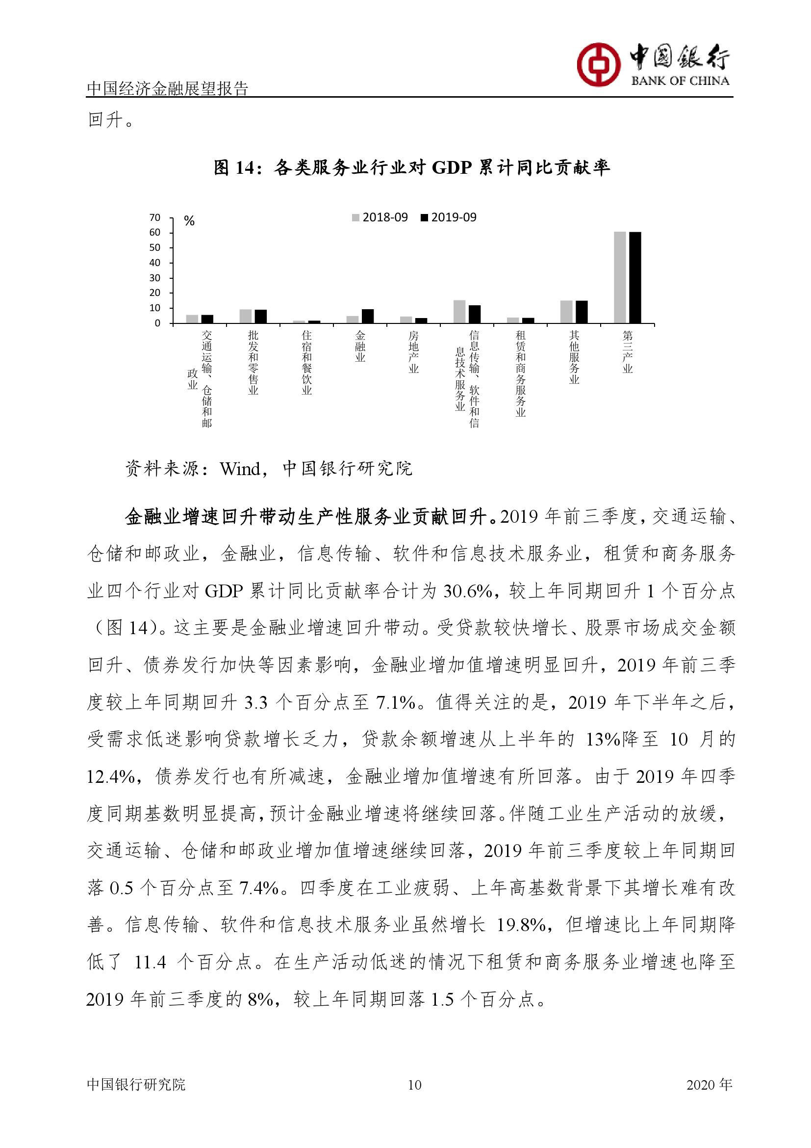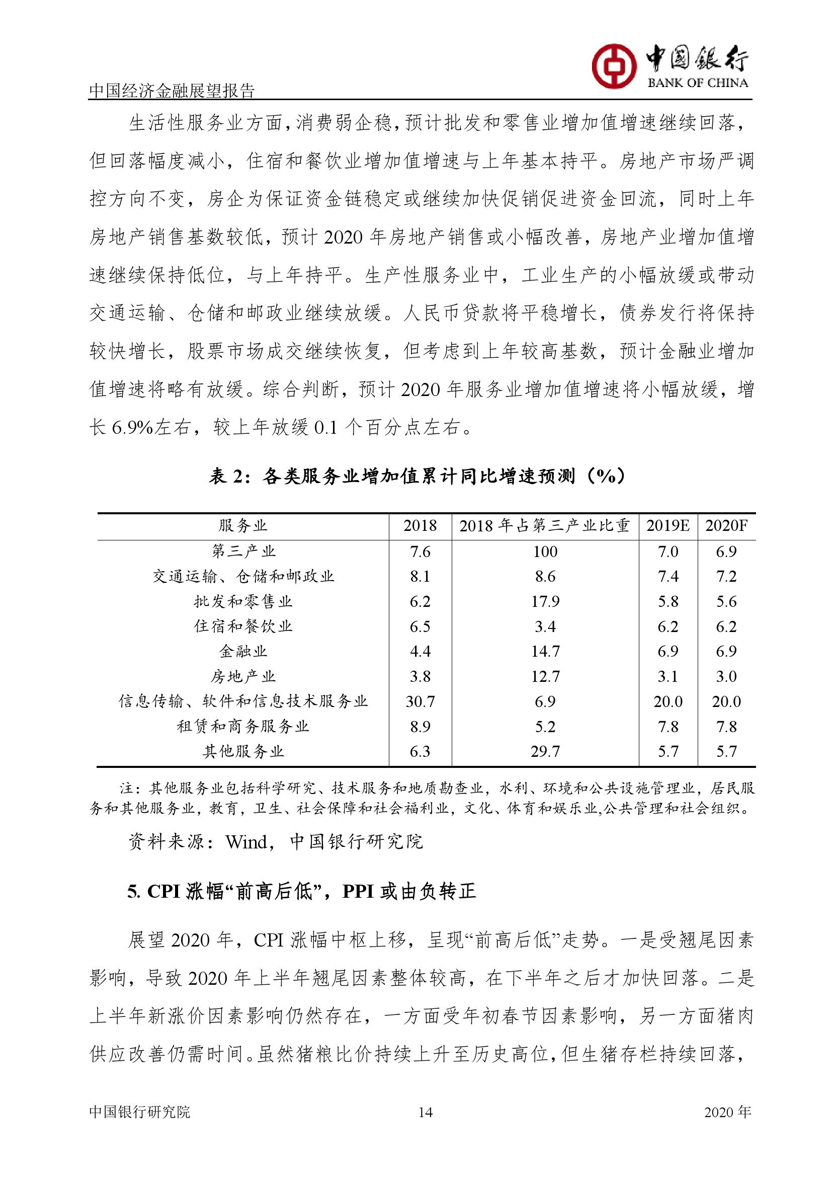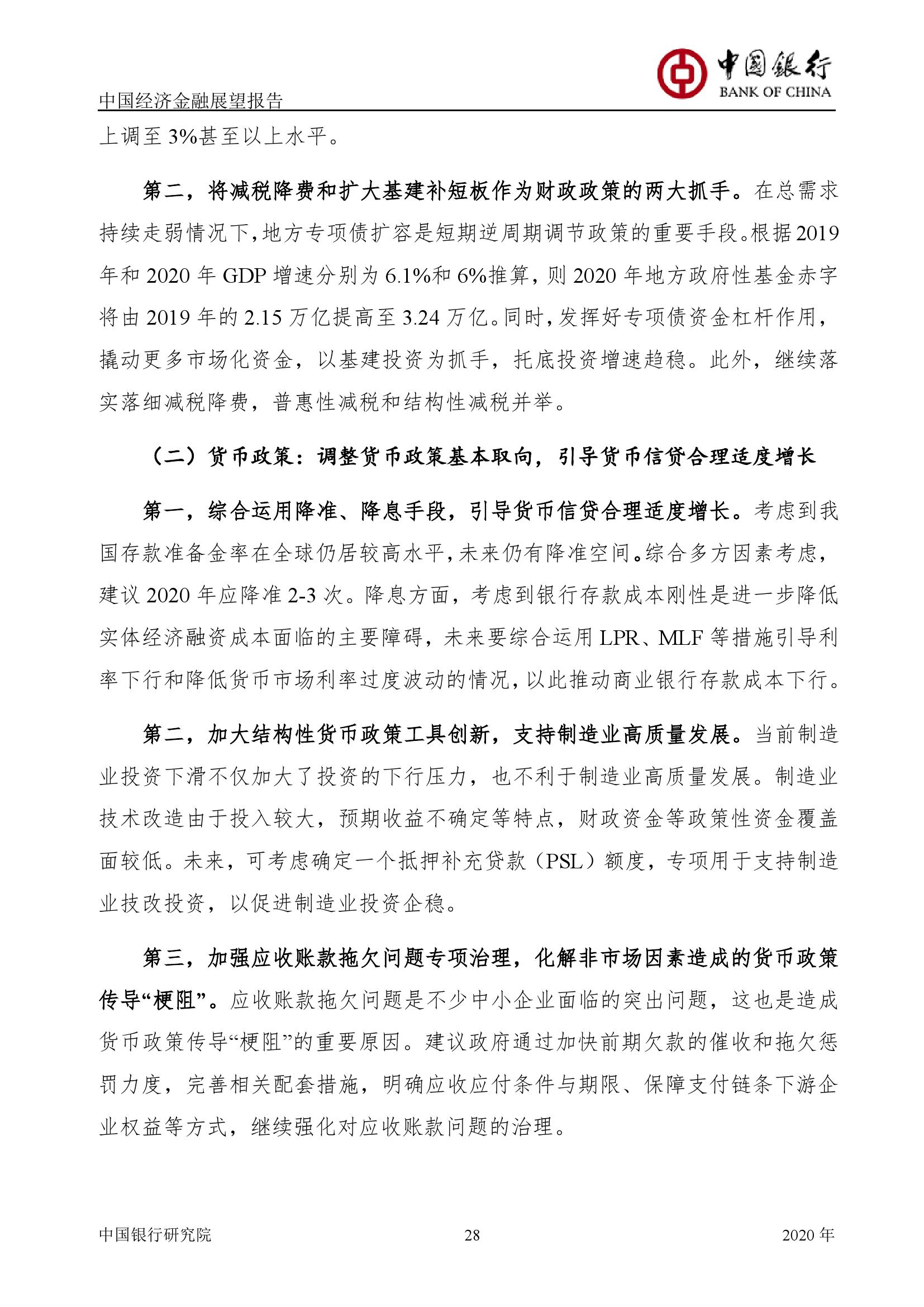 中国经济金融主要面临中美贸易摩擦、猪肉价格上涨、实体经济需求低迷、债券违约风险或向信贷市场传导等风险。展望2020年,中国经济面临的风险和挑战增多,总体判断“谨慎乐观”。按当前内外部市场环境,若政策不做大的调整,2020年中国经济自然增长率很可能会低于6%。