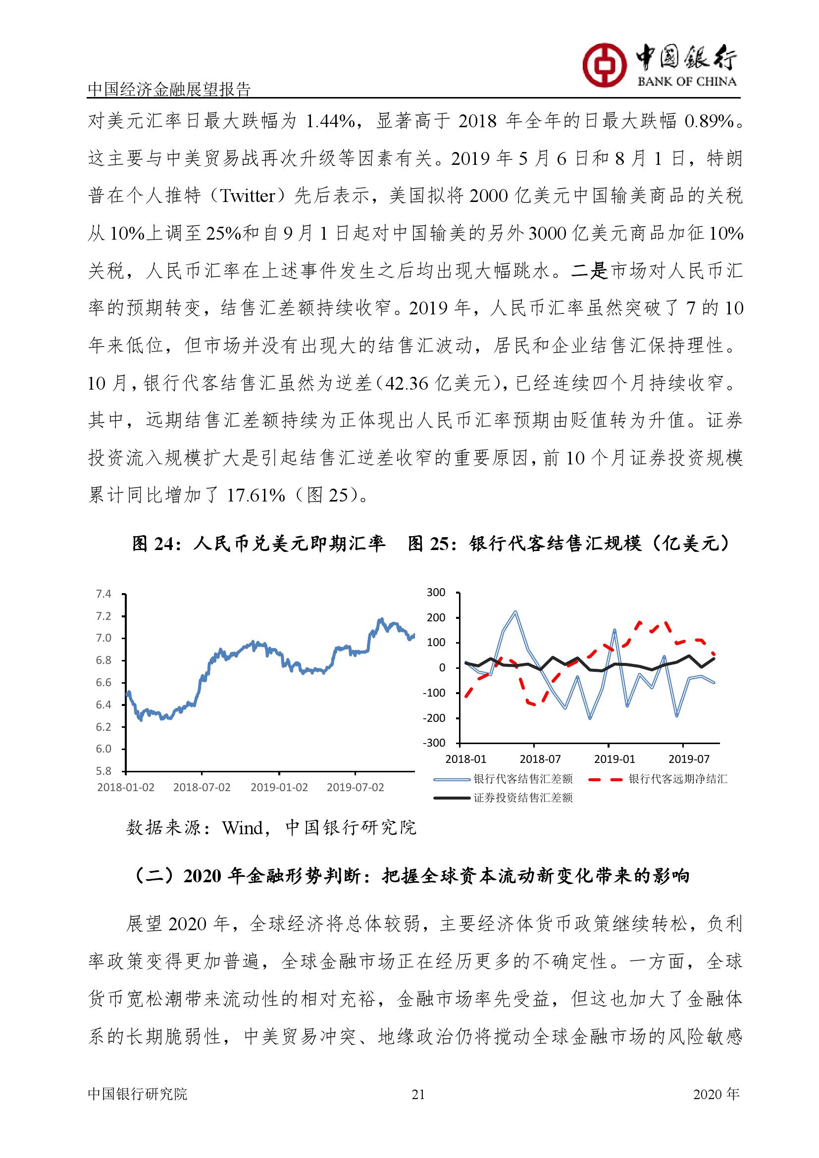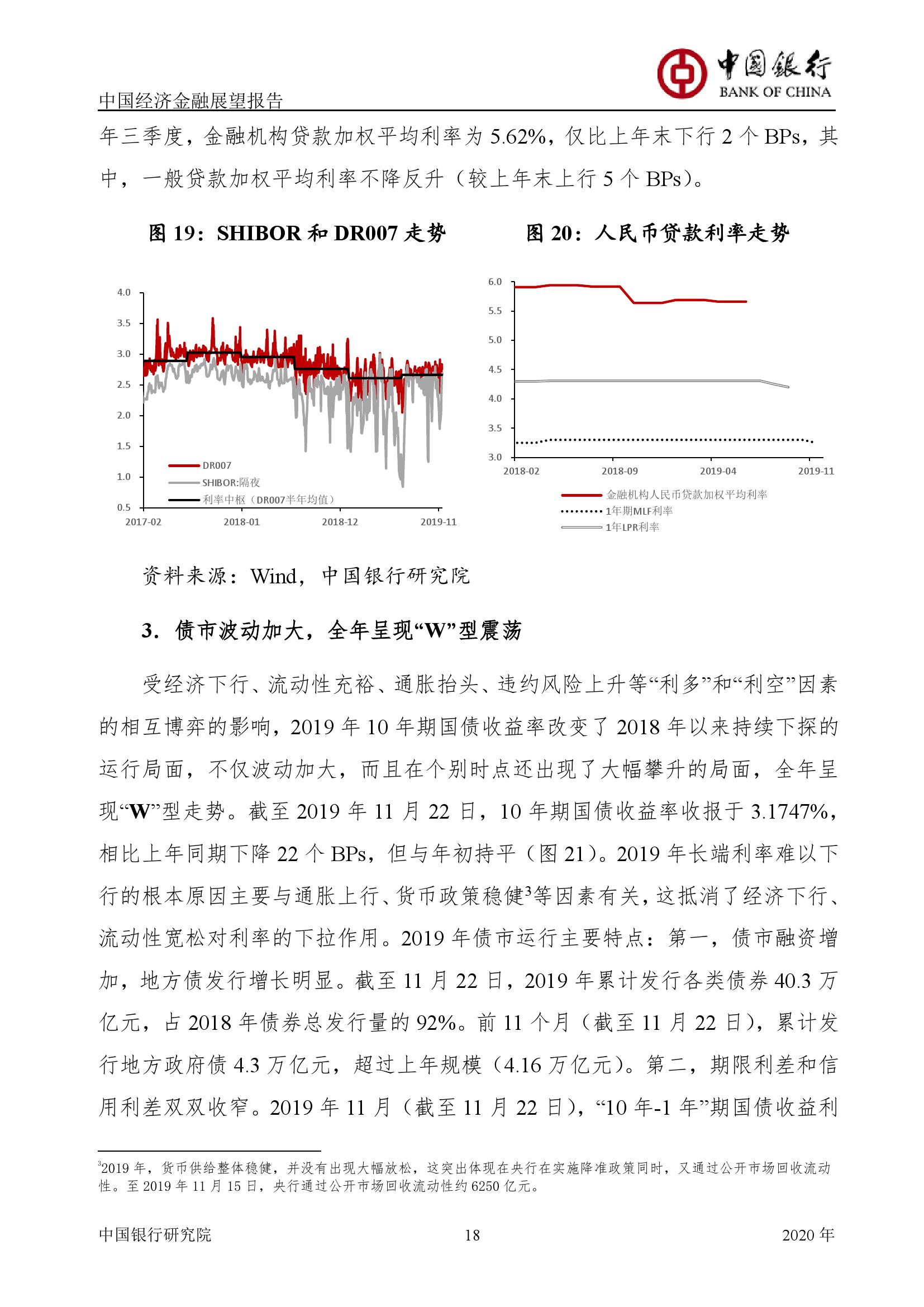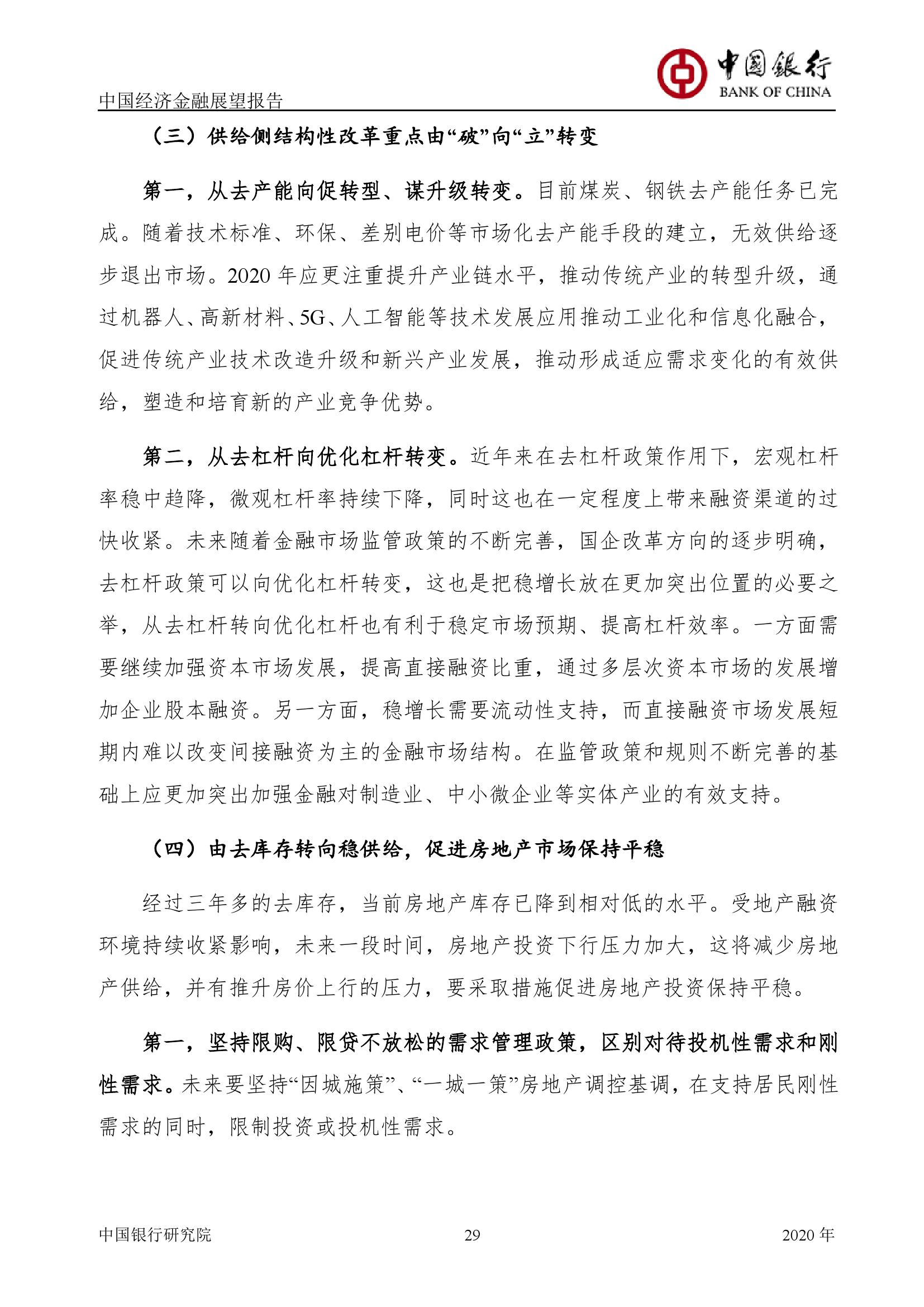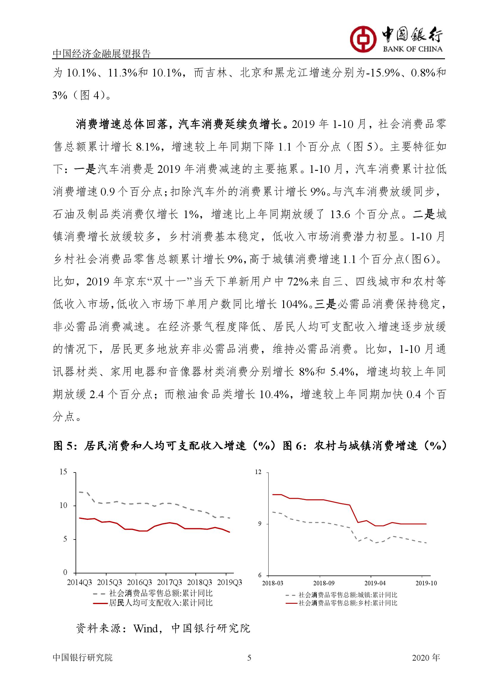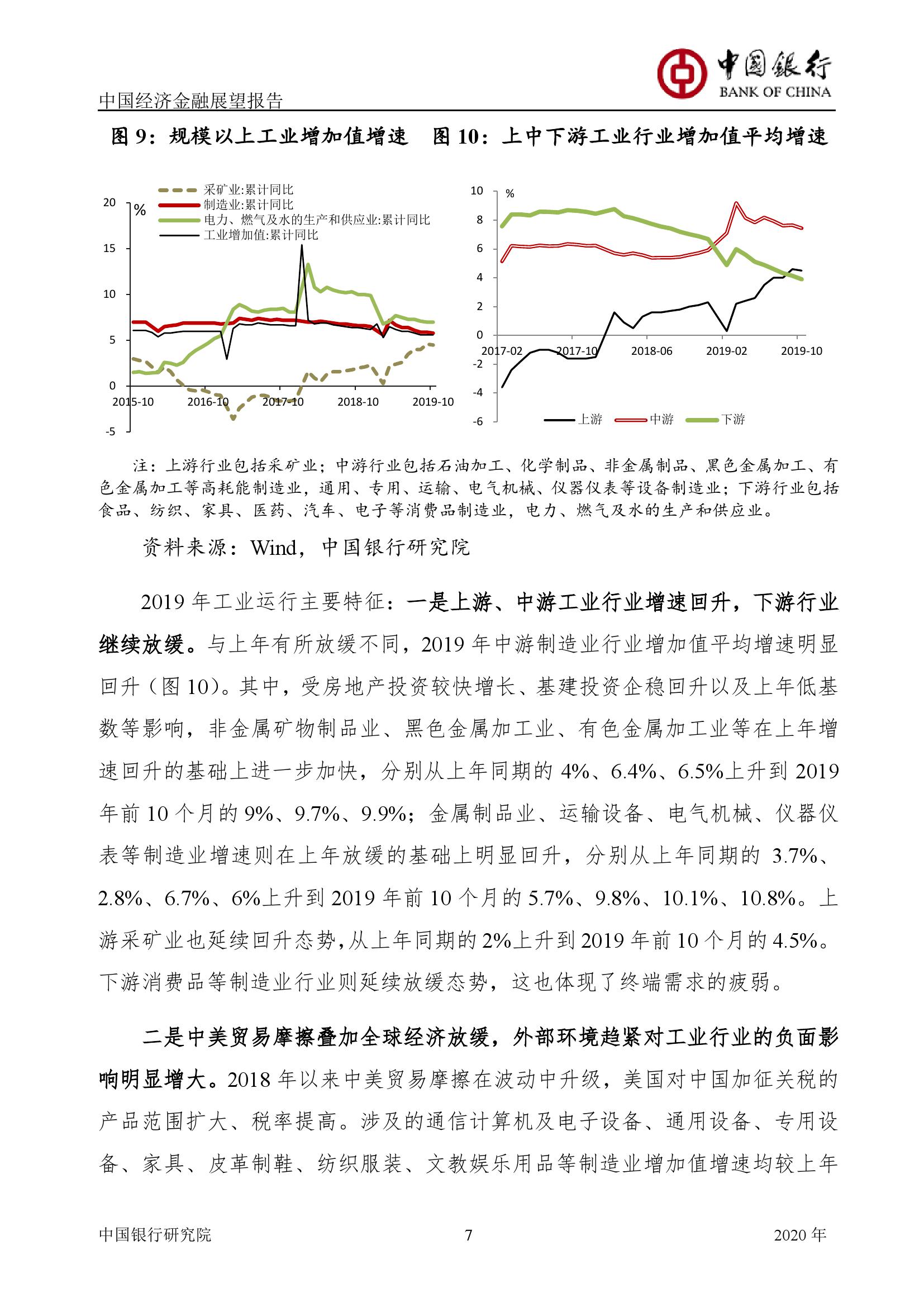 中国经济金融主要面临中美贸易摩擦、猪肉价格上涨、实体经济需求低迷、债券违约风险或向信贷市场传导等风险。展望2020年,中国经济面临的风险和挑战增多,总体判断“谨慎乐观”。按当前内外部市场环境,若政策不做大的调整,2020年中国经济自然增长率很可能会低于6%。