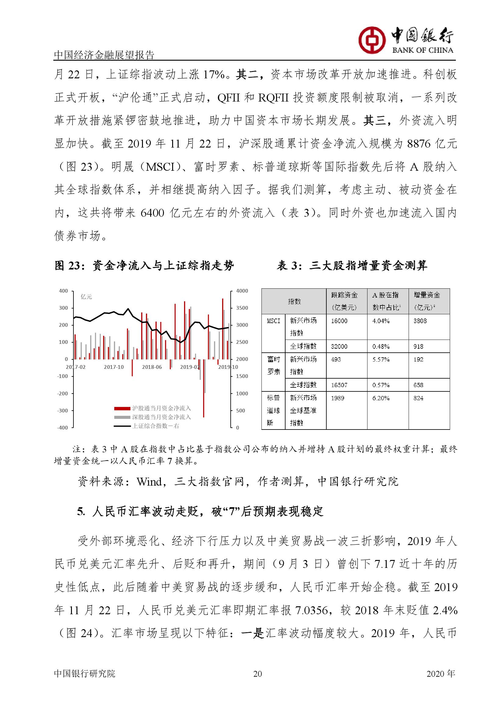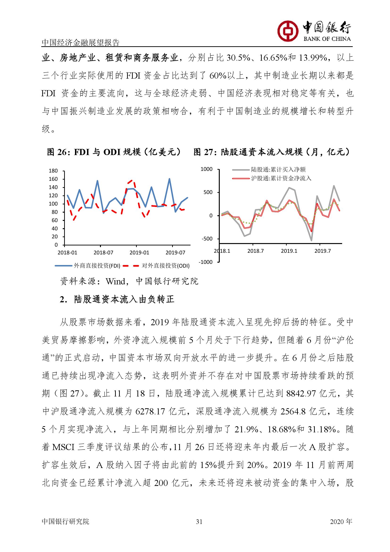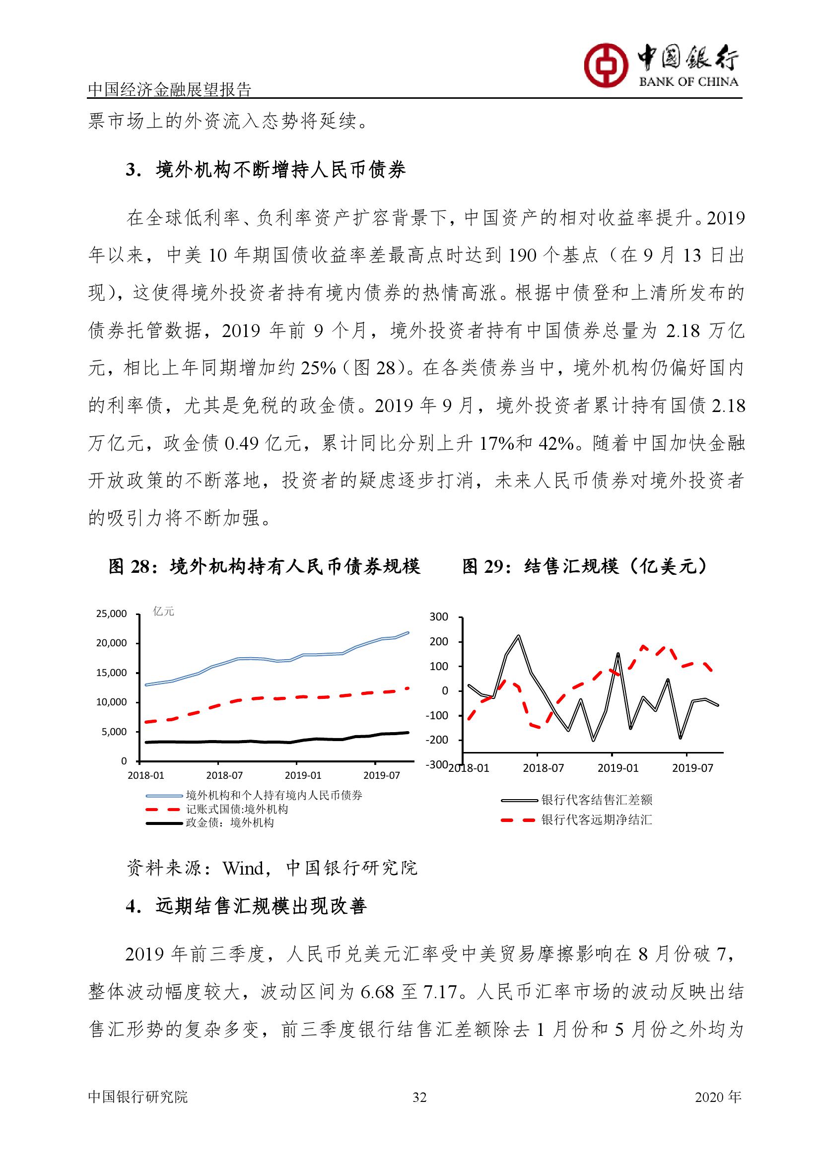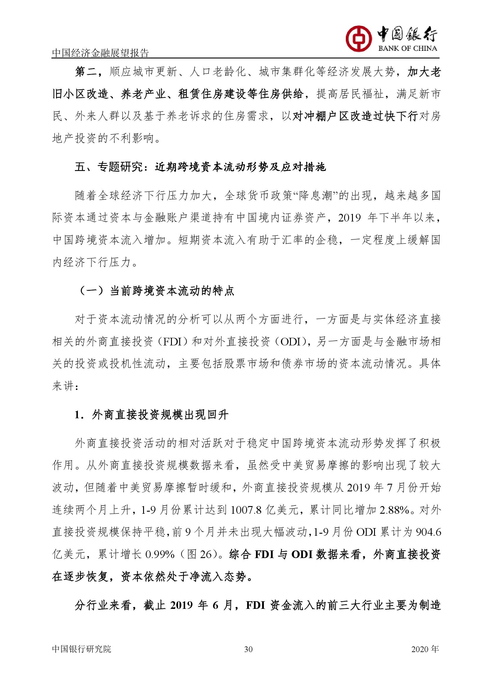 中国经济金融主要面临中美贸易摩擦、猪肉价格上涨、实体经济需求低迷、债券违约风险或向信贷市场传导等风险。展望2020年,中国经济面临的风险和挑战增多,总体判断“谨慎乐观”。按当前内外部市场环境,若政策不做大的调整,2020年中国经济自然增长率很可能会低于6%。