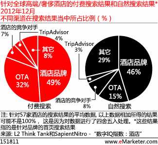 数字营销智库L2 Think Tank和数字机构SapientNitro在2012年12月公布的“数字IQ指数:酒店”数据指出,在针对全球高端酒店品牌关键词的首页自然搜索结果当中,46%的结果属于酒店品牌网站,而不是OTA网站或TripAdvisor的链接等等。