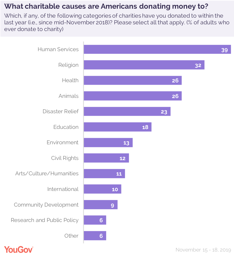 在过去的一年里,39%的捐赠者像人类服务慈善机构捐款,如无家可归者收容所、食物银行或青年服务组织。约1/3的受访者(32%)表示,他们曾向宗教慈善机构捐款,如教堂或基于信仰的媒体渠道。大约1/4的受访者(26%)捐赠给了与健康相关的慈善机构,同样数量的受访者(26%)捐赠给了与动物方面的慈善机构。