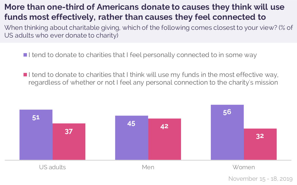 约有一半的美国捐赠者(51%)倾向于以某种方式向他们感到与之有某种个人联系的慈善机构捐款。37%的受访者向他们认为最有效利用资金的慈善机构捐款。男性(42%)比女性(32%)更有可能说这是他们对慈善捐赠的看法。