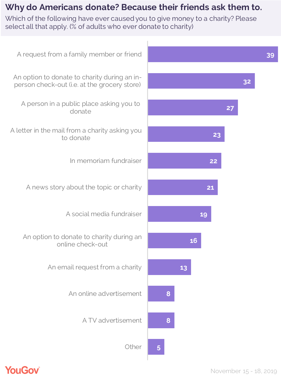 几乎4/10的美国人(39%)因为家人或朋友的请求而向慈善机构捐款。约1/3的受访者(32%)曾在杂货店或药店的店内结账时捐款;27%的受访者因为公开募捐曾向慈善机构捐款。约2/3的受访者(66%)会以自己名义进行慈善捐赠。这可能是这个假日季节给年长亲戚的一个很好的礼物创意:55岁以上的美国人(73%)特别可能会考虑以自己的名义向支持的慈善机构捐款,并认为这是一份好礼物。