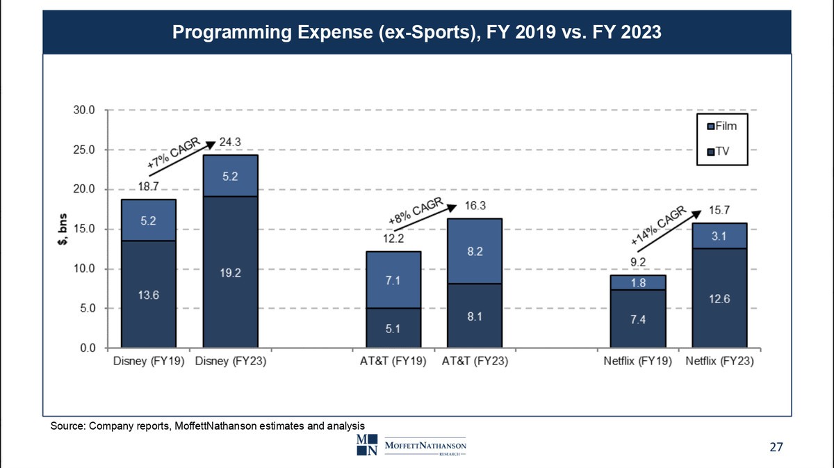 这1300万消费者对流媒体来说是一个巨大的市场。下图显示了迪士尼、HBO所有者AT&T和Netflix在未来四年里在电影和电视节目上的巨大支出,这些电影和电视节目最终将在他们的流媒体服务上投放。Nathanson预计总增幅为162亿美元。