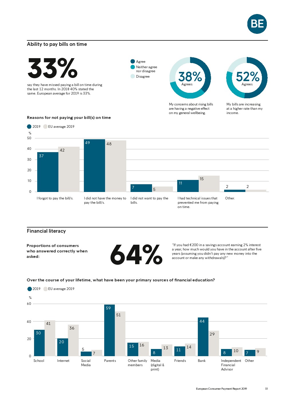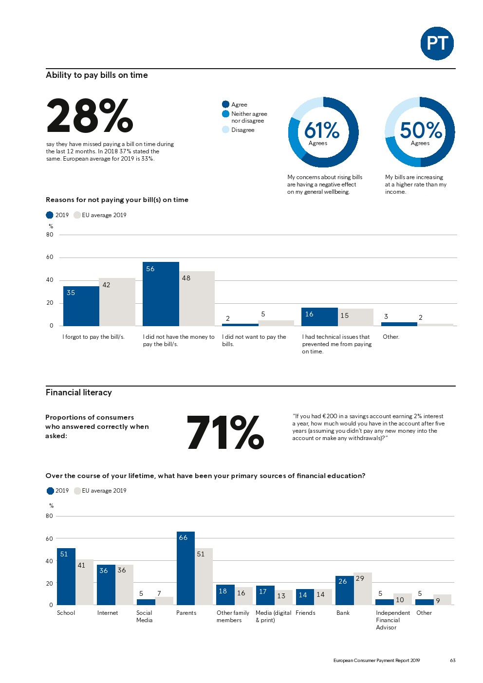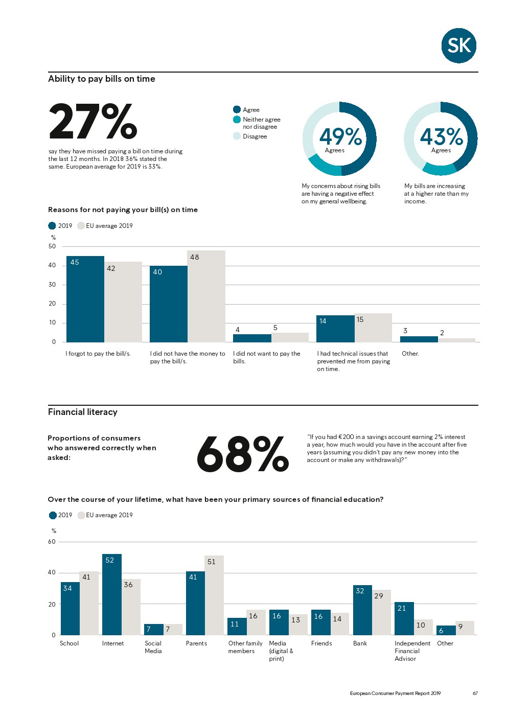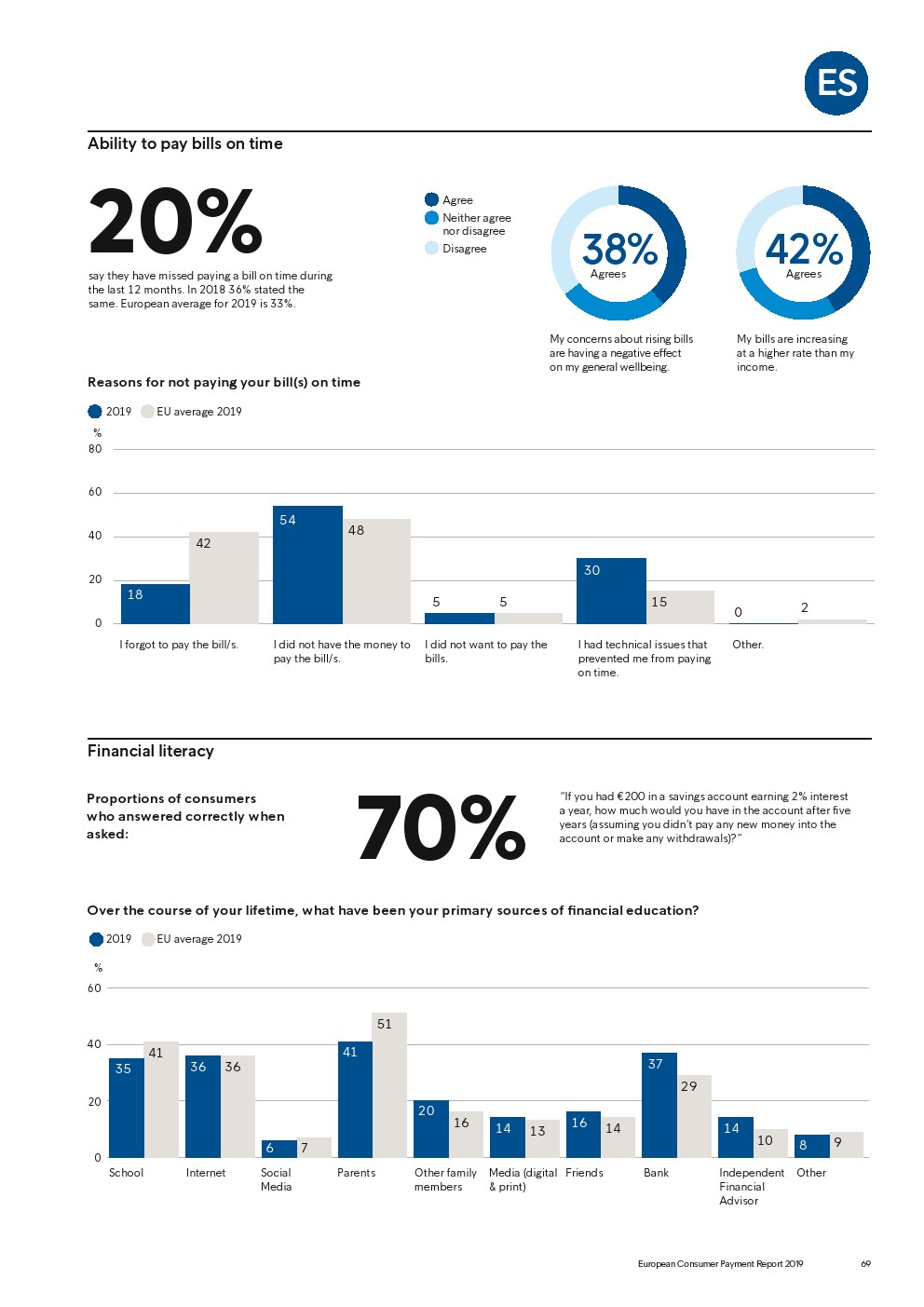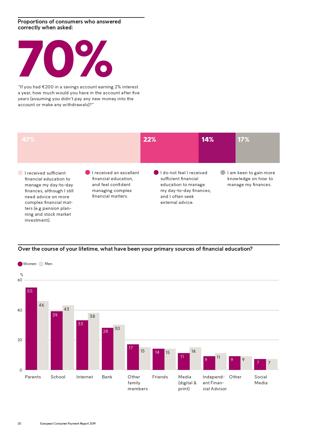 69%的受访者认为他们的金融教育已经足够,但是37%未能将基本的金融术语与其正确的定义相匹配,尤其是年轻消费者。大多数欧洲消费者(51%)的金融教育主要来源是父母,但是他们更希望学校能够给孩子们传授这方面的知识(63%)。