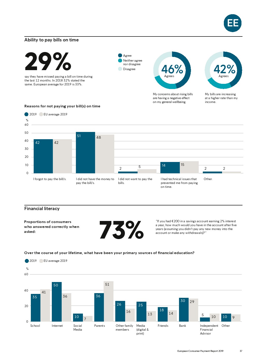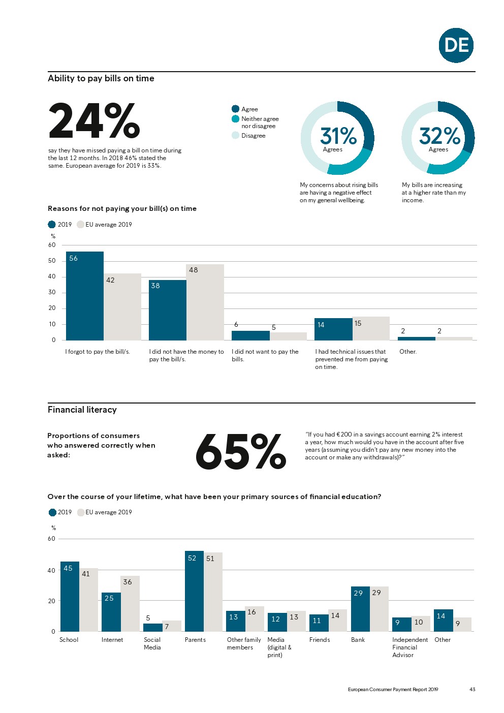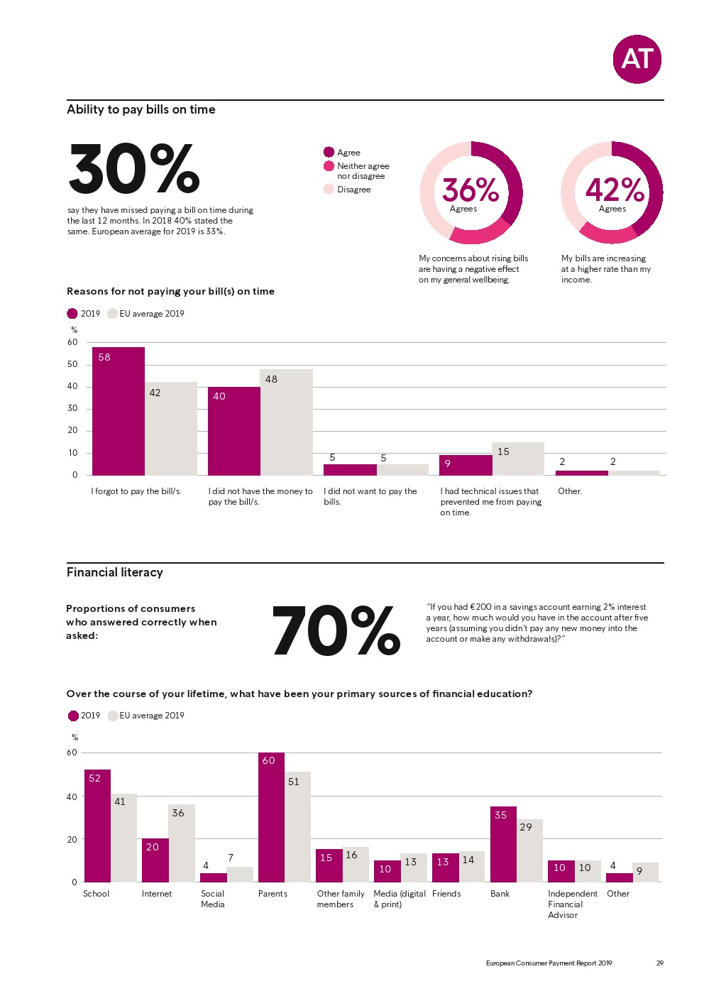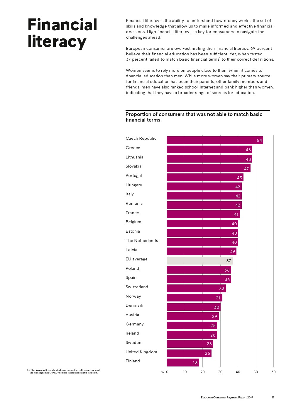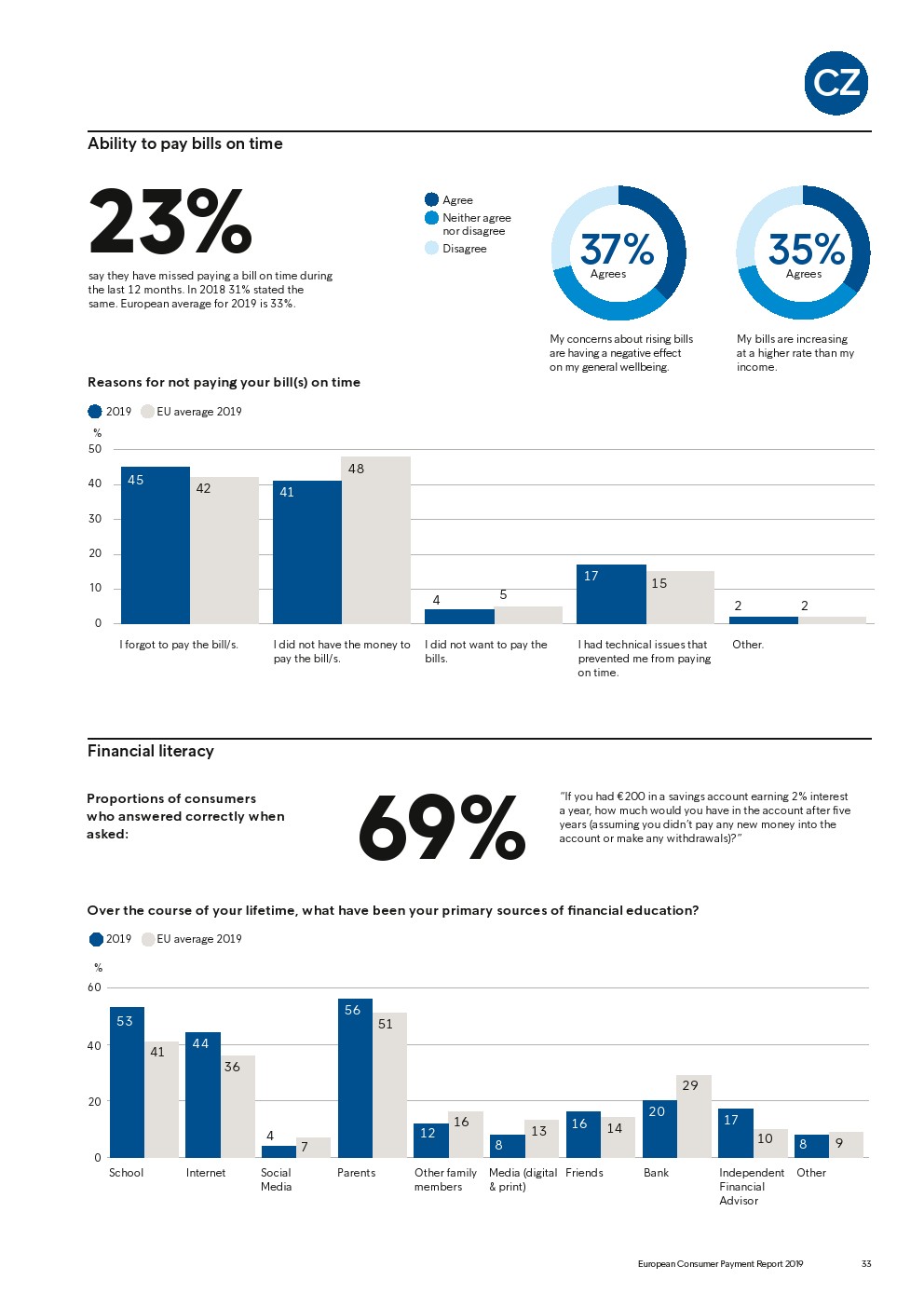 69%的受访者认为他们的金融教育已经足够,但是37%未能将基本的金融术语与其正确的定义相匹配,尤其是年轻消费者。大多数欧洲消费者(51%)的金融教育主要来源是父母,但是他们更希望学校能够给孩子们传授这方面的知识(63%)。