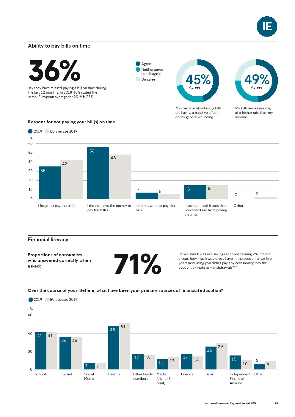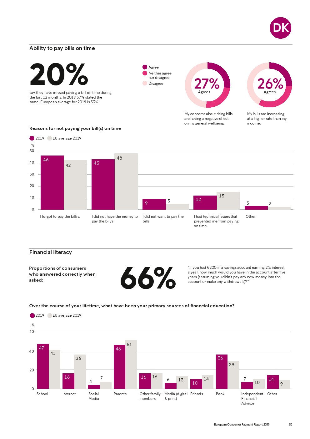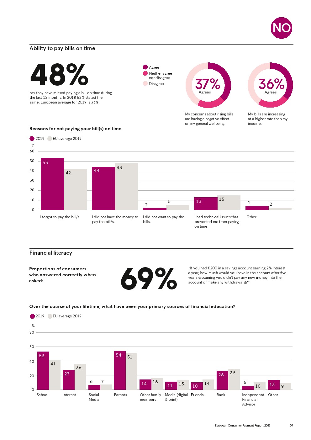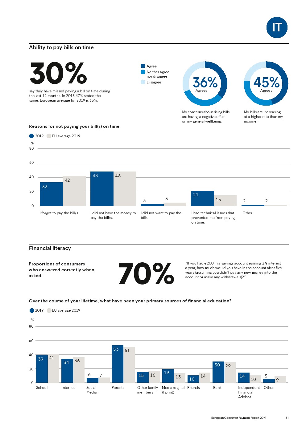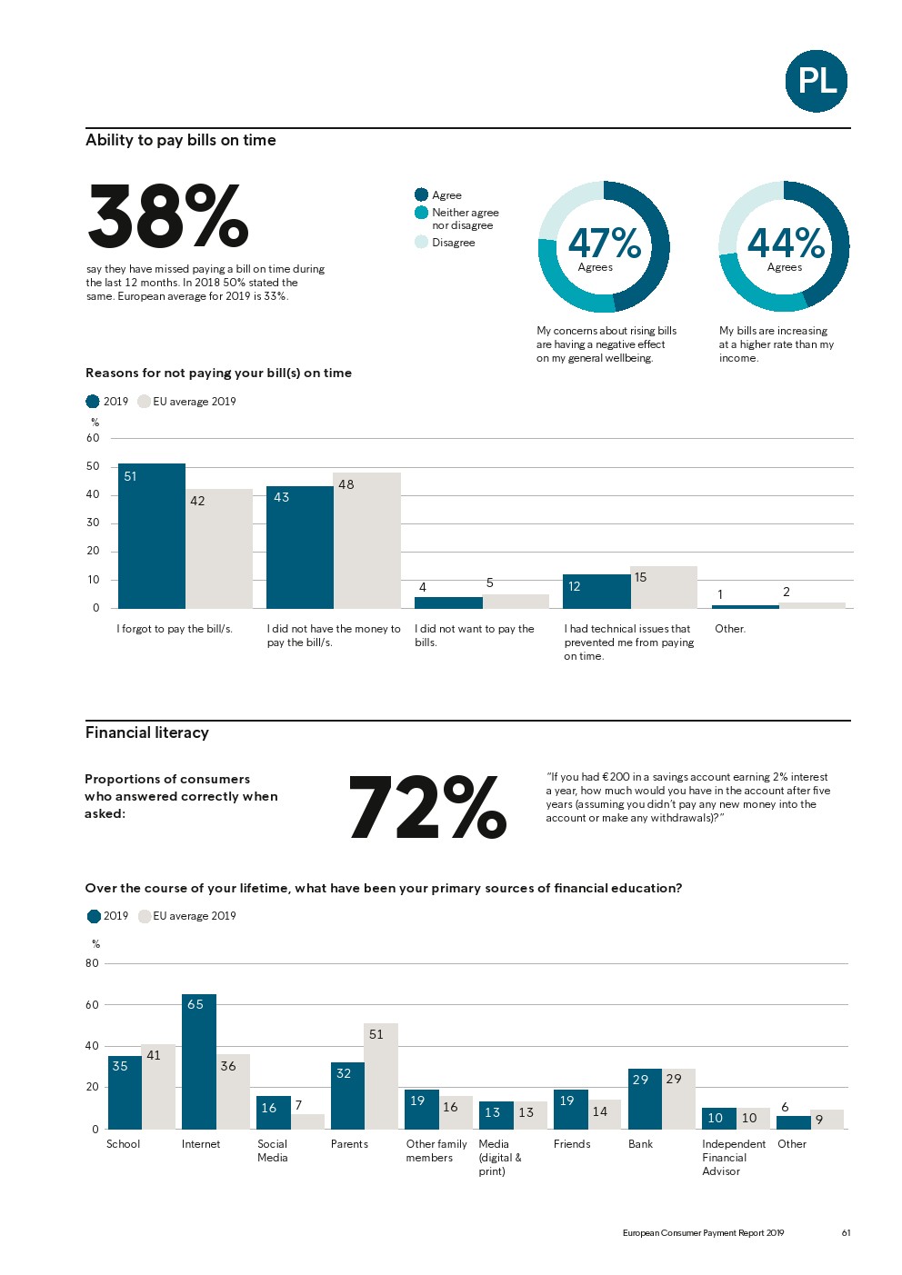 69%的受访者认为他们的金融教育已经足够,但是37%未能将基本的金融术语与其正确的定义相匹配,尤其是年轻消费者。大多数欧洲消费者(51%)的金融教育主要来源是父母,但是他们更希望学校能够给孩子们传授这方面的知识(63%)。