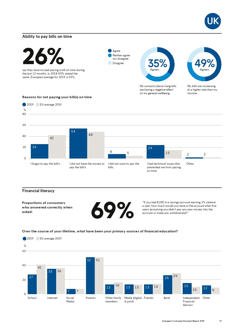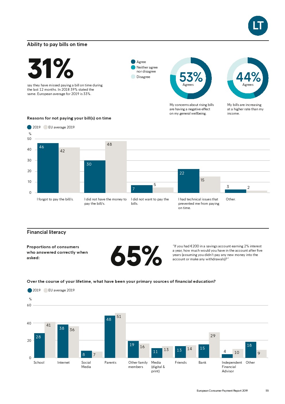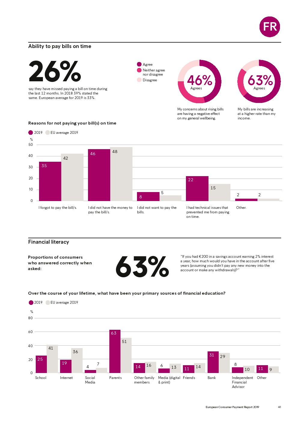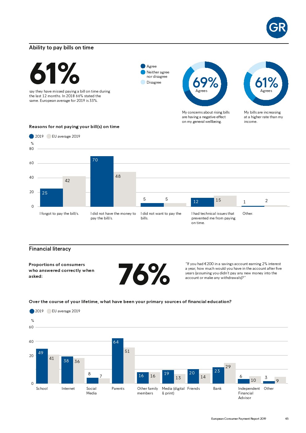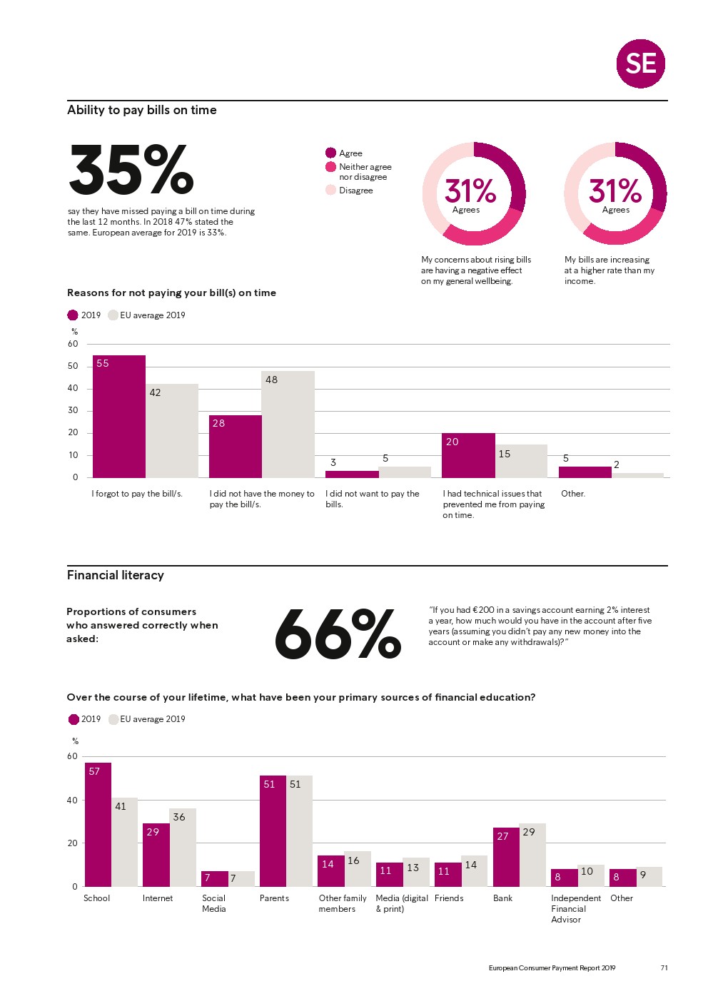 69%的受访者认为他们的金融教育已经足够,但是37%未能将基本的金融术语与其正确的定义相匹配,尤其是年轻消费者。大多数欧洲消费者(51%)的金融教育主要来源是父母,但是他们更希望学校能够给孩子们传授这方面的知识(63%)。