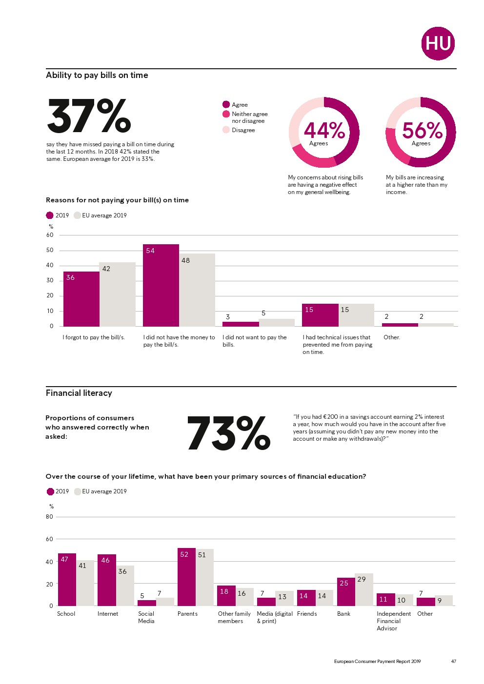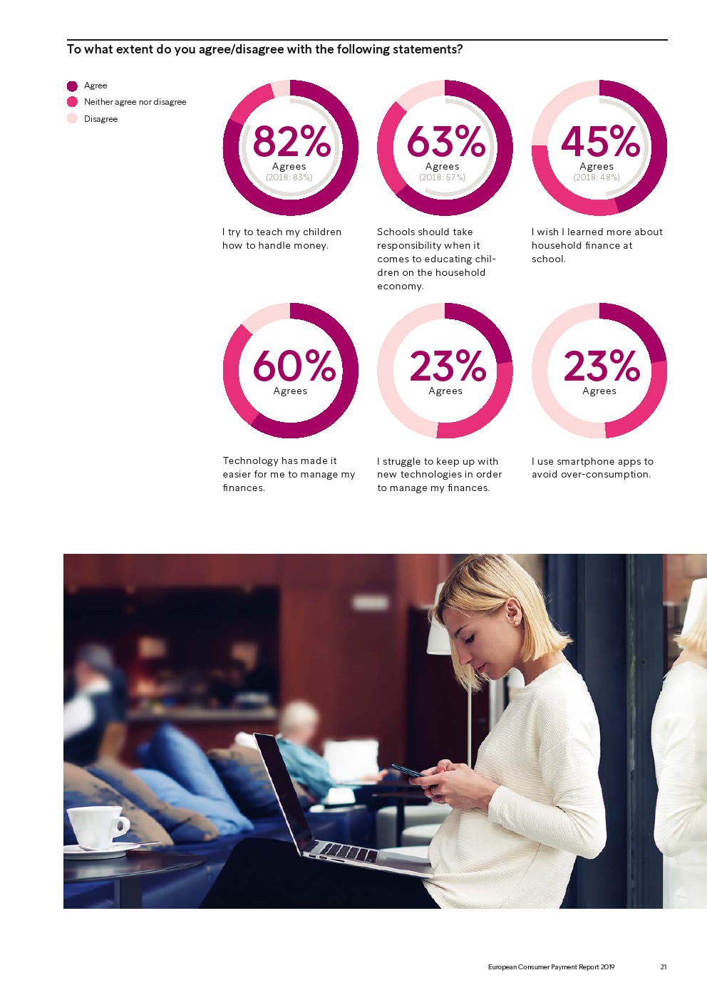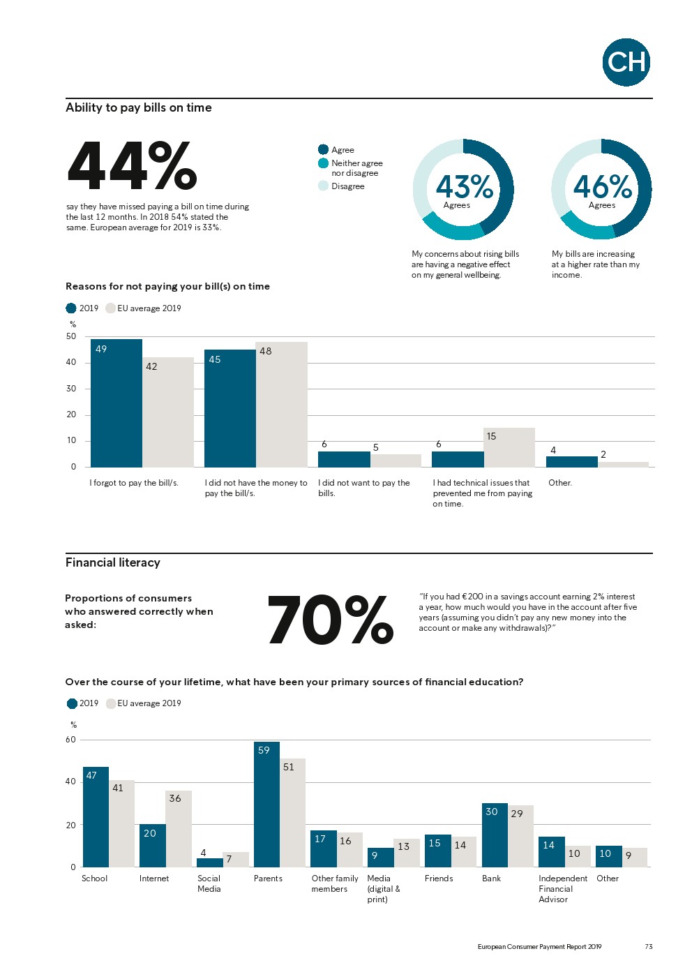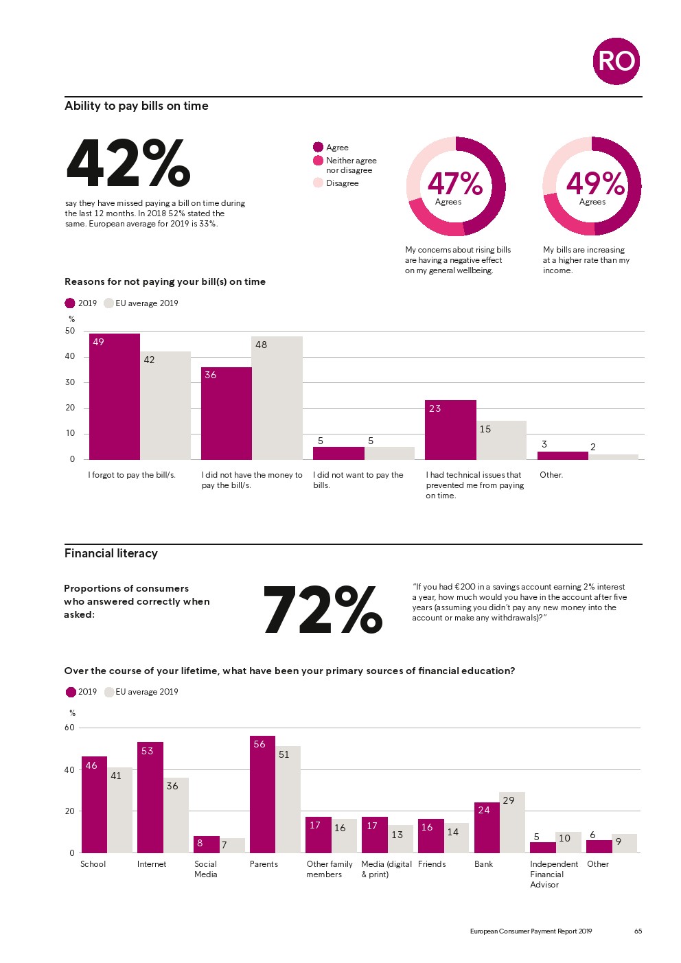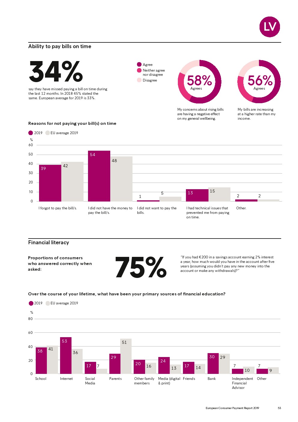 69%的受访者认为他们的金融教育已经足够,但是37%未能将基本的金融术语与其正确的定义相匹配,尤其是年轻消费者。大多数欧洲消费者(51%)的金融教育主要来源是父母,但是他们更希望学校能够给孩子们传授这方面的知识(63%)。
