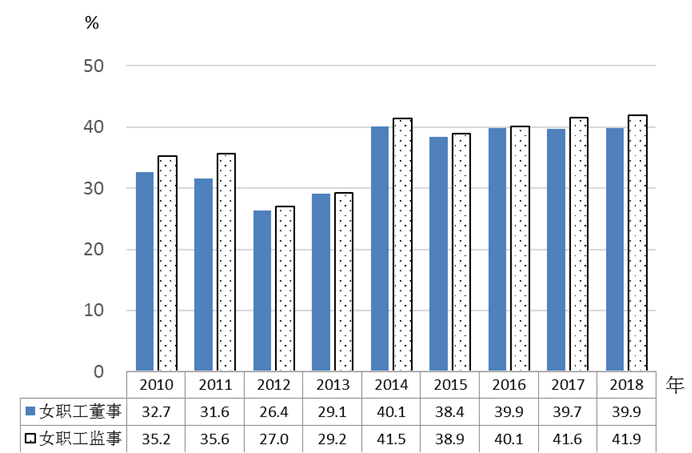 图6 2010—2018年职工董事和职工监事中女性所占比重情况