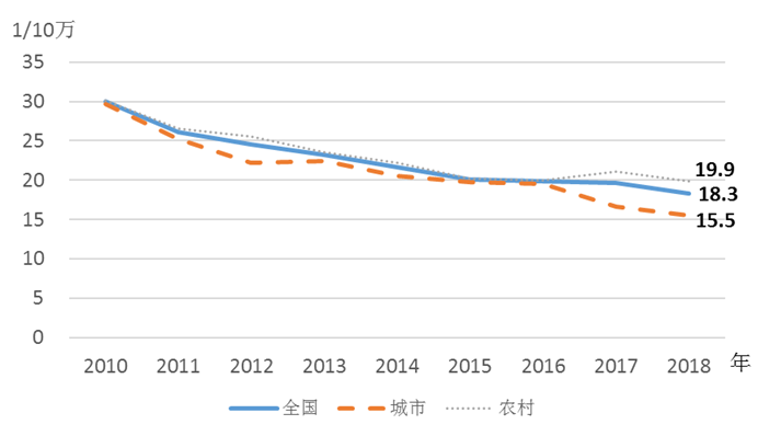 2.孕产妇死亡率持续降低。2018年,孕产妇死亡率18.3/10万,比上年降低6.6%,比2010年降低39%,优于中高收入国家的平均水平。同期城市与农村孕产妇死亡率分别为15.5/10万和19.9/10万,分别比上年降低6.6%和5.7%,比2010年降低47.8%和33.9%(见图1)。