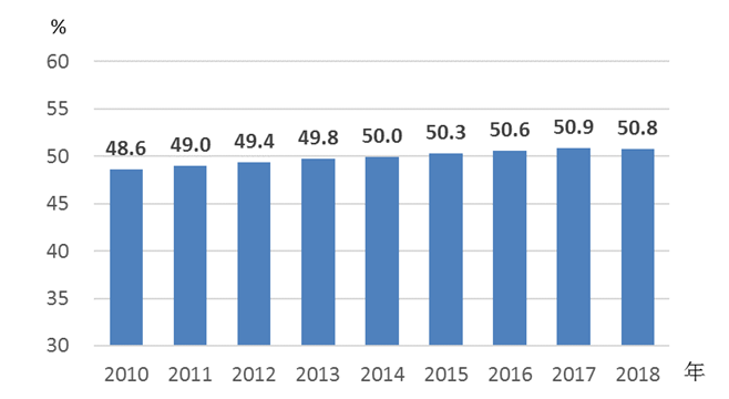 图3 2010—2018年普通高中在校生中女生所占比重情况