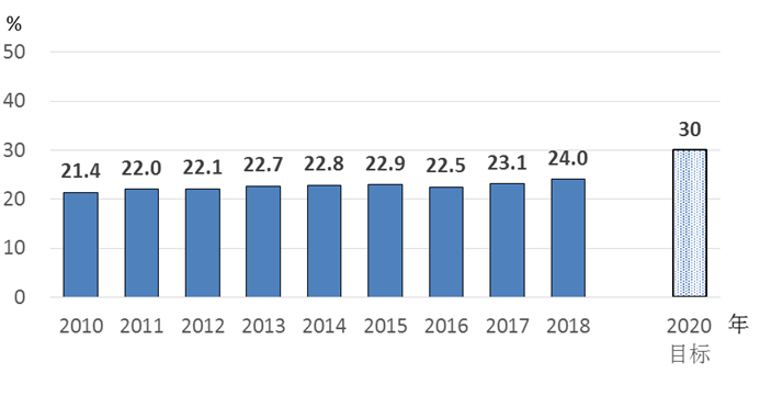 2018年,村委会成员中女性所占比重为24%,虽然比上年提高0.9个百分点,也比2010年提高2.6个百分点,但距“达到30%以上”的《纲要》目标仍存在差距(见图9)。