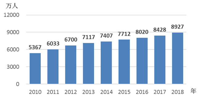 2.女性基本医疗保险覆盖面继续扩大。据不完全统计,2018年,全国女性参加基本医疗保险的人数超过5.4亿人,比上年增加1926万人,是2011年的2.9倍。其中女性参加城镇职工基本医疗保险的人数为1.5亿人,比上年增加643万人,比2011年增加3547万人;女性参加城乡居民基本医疗保险的人数超过3.9亿人[2],比上年增加1283万人,是2011年的5.2倍。