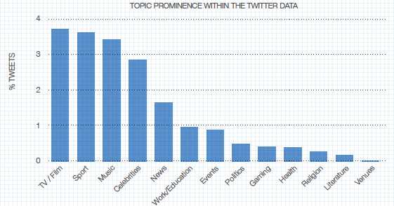 电影/电视,体育和音乐是最热门的话题,但Twitter上4/5的内容都属于那些个人化的内容,比如生日,名言,星座,节食等