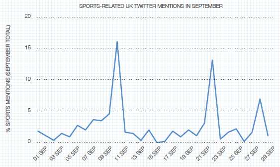 男性是参与体育赛事的主力军,而讨论最热烈的时候往往也发生在赛事直播期间,大型体育赛事播出时间,Twitter上的讨论会呈现非常集中的场面