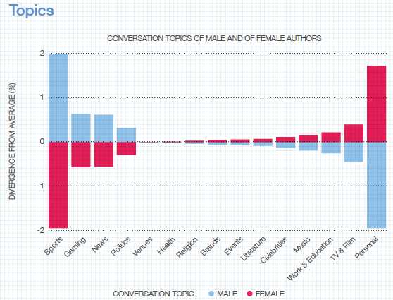 性别差异方面,男性喜欢体育,游戏,新闻和政治,而女性则更喜欢讨论电视,工作,教育和音乐,女性更喜欢发表和个人有关的内容