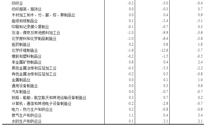 工业生产者购进价格中,农副产品类价格上涨7.2%,建筑材料及非金属类价格上涨2.9%;化工原料类价格下降8.4%,燃料动力类价格下降5.8%,有色金属材料及电线类价格下降2.3%,黑色金属材料类价格下降0.5%。