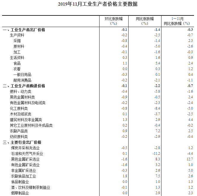 2019年11月份,全国工业生产者出厂价格同比下降1.4%,环比下降0.1%;工业生产者购进价格同比下降2.2%,环比下降0.1%。1—11月平均,工业生产者出厂价格比去年同期下降0.3%,工业生产者购进价格下降0.7%。