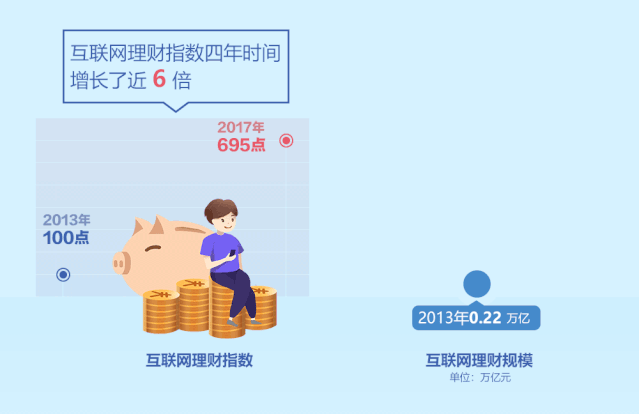 互联网理财指数由2013年的100点增长到2017年的695点,四年时间增长了近6倍,互联网理财规模也由0.22万亿元增长到3.15万亿元,预计到2020年我国互联网理财规模将达15.5万亿元。