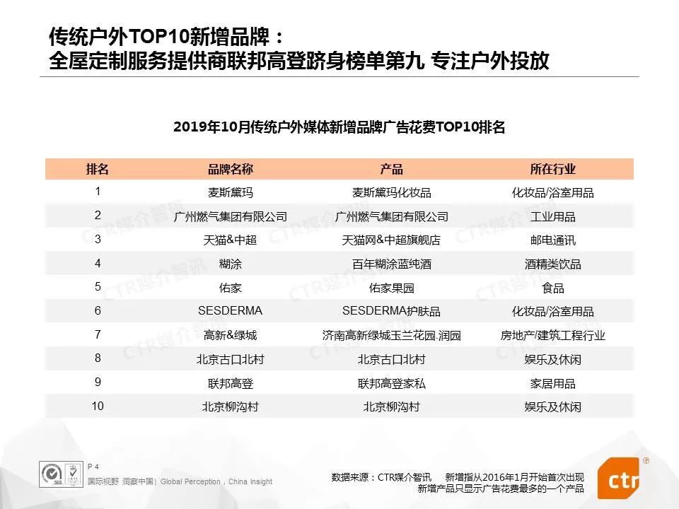 户外生活圈媒体各新增品牌榜单中均有药品品牌入榜,分别位列电梯电视和电梯海报榜首的康恩贝和金笛同属康恩贝集团旗下品牌。康恩贝集团是以现代中药和植物药为核心业务的制药企业。影院视频媒体榜单中排名第九的葛兰素史克则是全球领先的处方药和疫苗供应商。