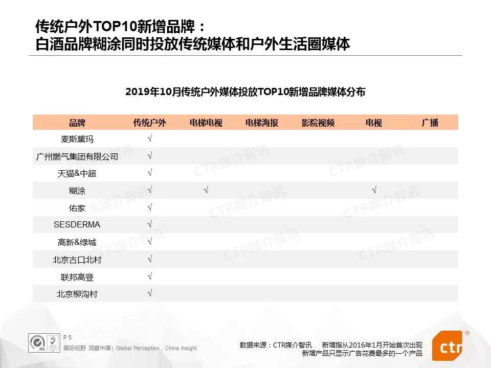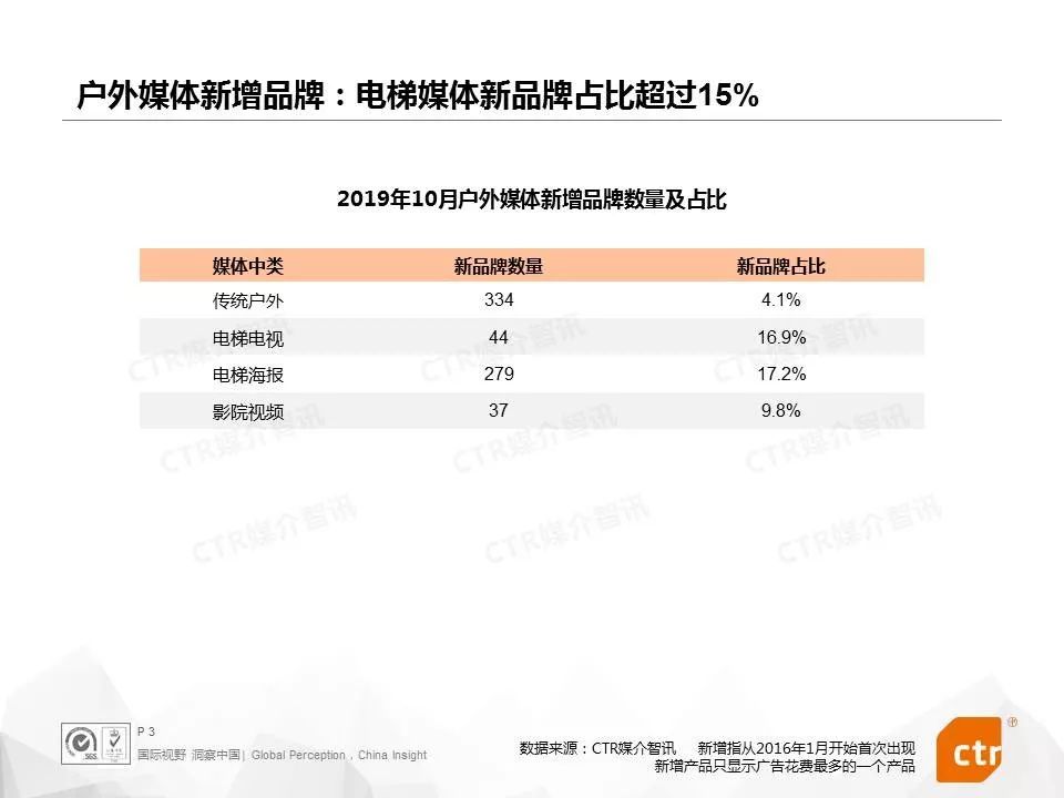 10月,传统户外媒体有334个新品牌,其次是电梯海报媒体,有279个新品牌。从新品牌占比来看,电梯电视和电梯海报媒体数值接近,分别为16.9%和17.2%。