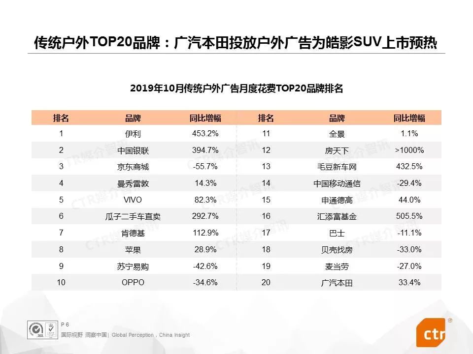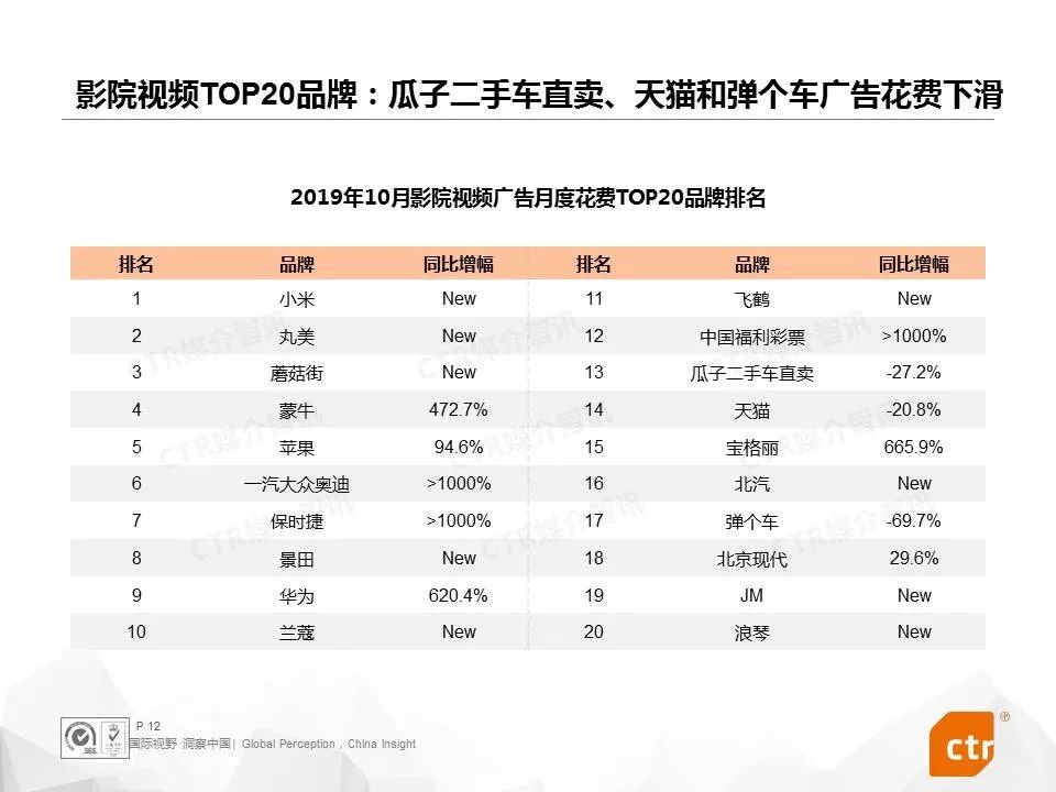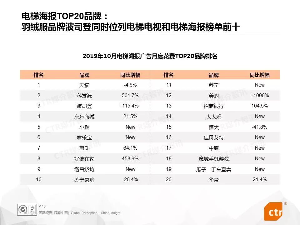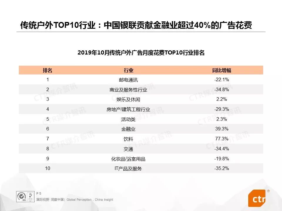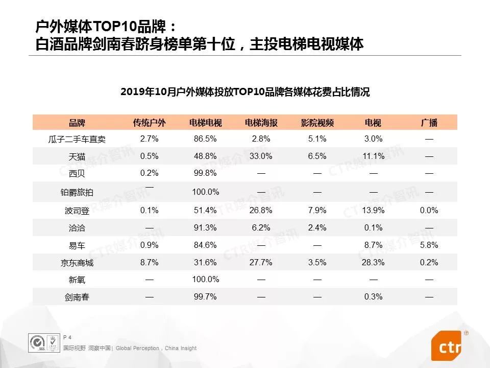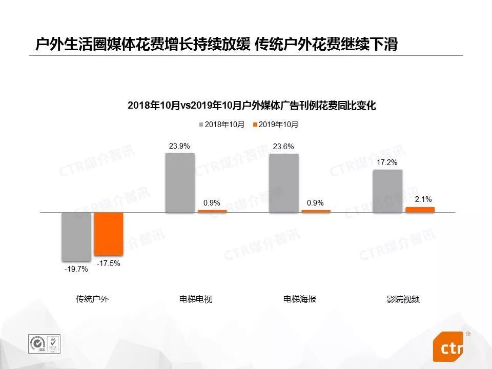 10月,传统户外媒体广告刊例花费同比下滑17.5%,降幅较去年同期略有收窄。电梯媒体花费增幅不超过1%,影院视频媒体花费增幅为2.1%。