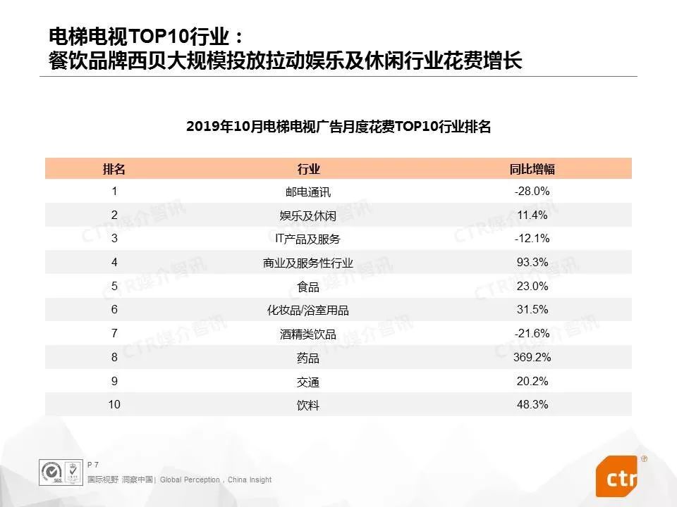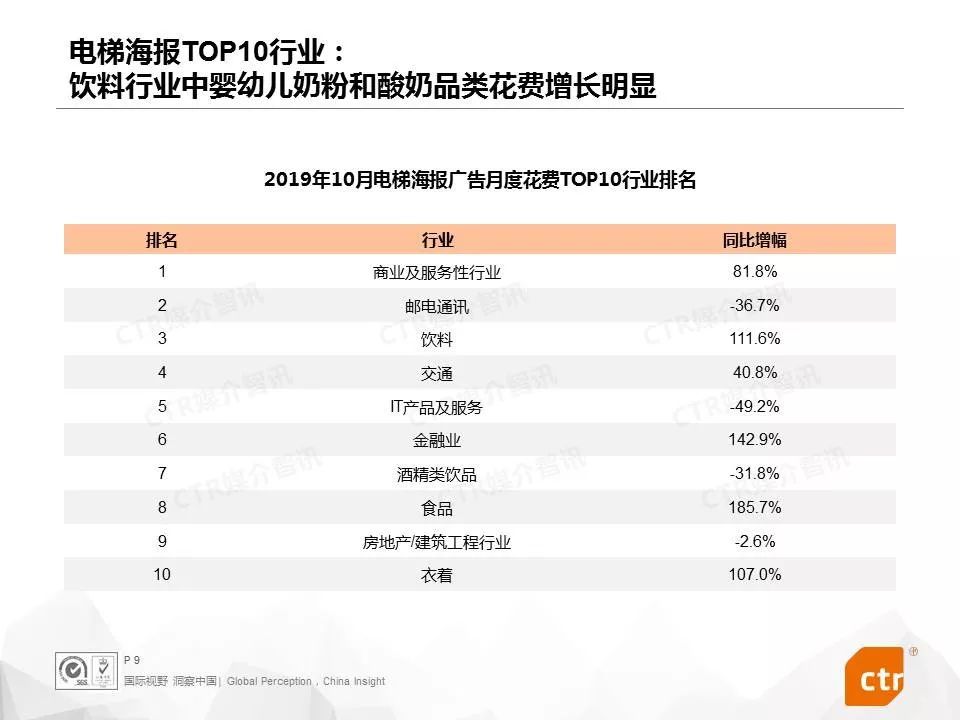 分行业来看,10月,饮料行业在多个户外媒体进行了广告增投,其中以电梯海报和影院视频媒体的花费增长较为明显,增幅超过100%,并分别跻身两大媒体行业花费榜单的第三和第五位。电梯海报媒体中,婴幼儿奶粉品类贡献饮料行业87.7%的广告花费,君乐宝、惠氏和艾佳贝特等奶粉品牌花费增投显著。影院视频媒体中,饮料行业的高增长主要由两大头部品牌拉动,蒙牛和飞鹤的广告花费占行业总体的70%。