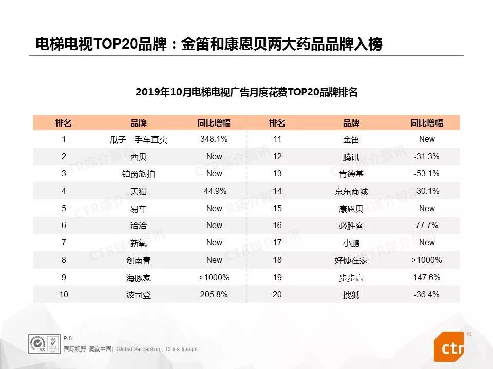 食品行业在电梯电视和电梯海报媒体同样表现出增长态势,花费增幅为23.0%和185.7%。调味品品牌太太乐和零食品牌洽洽同时位列两大电梯媒体食品行业品牌花费榜单前三。不过在不同的媒体渠道,品牌的宣传重点略有差异。太太乐在电梯电视媒体重点宣传鲜酱油,在电梯海报媒体主要宣传鸡精调味品。而洽洽则选择电梯电视媒体宣传公司形象,将新产品每日坚果放在电梯海报媒体进行推广。