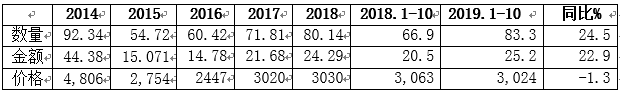 据中国海关统计,2019年1-10月中国共进口大包奶粉83.29万吨,同比增加24.5%,进口额25.19亿美元,同比增长22.9%,平均价格为3024美元/吨,同比下降1.3%。