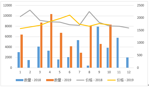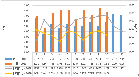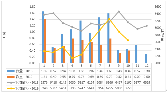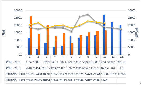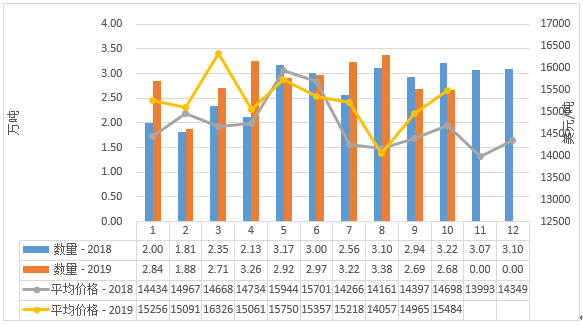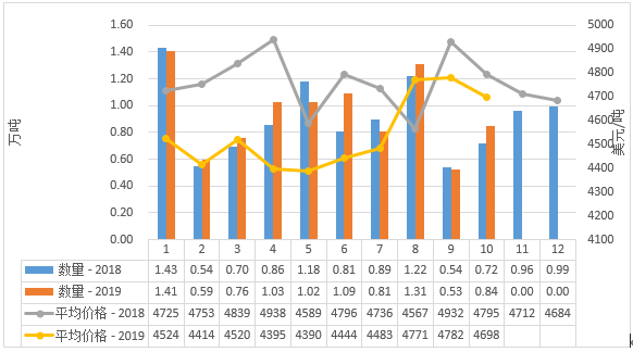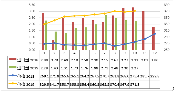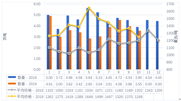 Figure3‑2中国婴幼儿配方奶粉月度进口量及价格2018-2019