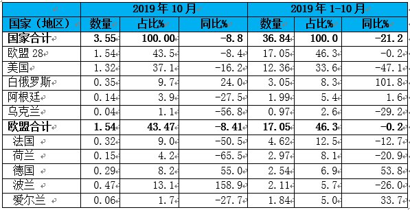 其中,从欧盟进口1.54万吨,占43.5%,同比减少8.4%,从美国进口1.32万吨,占37.1%,同比减少16.2%,从白俄罗斯进口0.35万吨,占9.7%,同比增加24%。