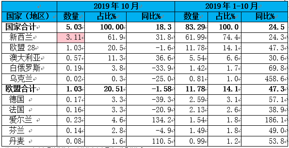 其中,从新西兰进口61.99万吨,占74.4%,同比增加24.3%,从欧盟进口11.78万吨,占14.1%,同比增加47.3%,从澳大利亚进口5.54万吨,占6.6%,同比增加30.6%。