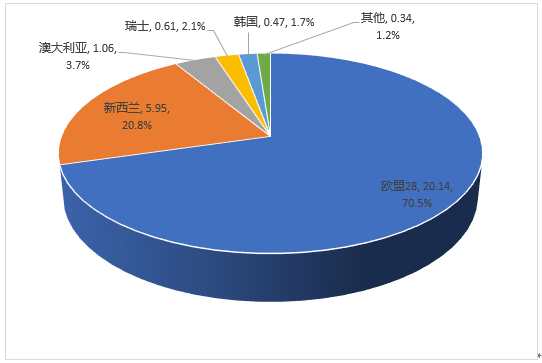 其中,从欧盟进口20.14万吨,占70.5%,同比增加0.9%,从新西兰进口5.95万吨,占20.8%,同比增加44.4%,从澳大利亚进口1.06万吨,占3.7%,同比增加15.3%。