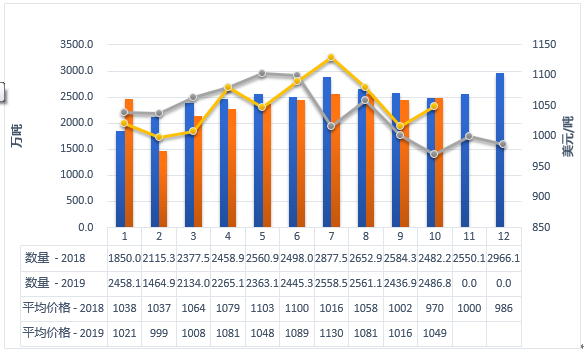据海关统计,1-10月,我国进口苜蓿干草累计104.92万吨,同比减13.6%,苜蓿进口量减少与牧场2018年下半年配方调整有较大关系;进口金额3.54亿美元,同比减9.9%,平均到岸价337.86美元/吨,同比涨4.3%。