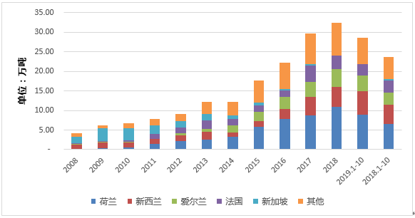 Figure 3‑3中国婴幼儿配方奶粉进口量及来源国变化2008-2019