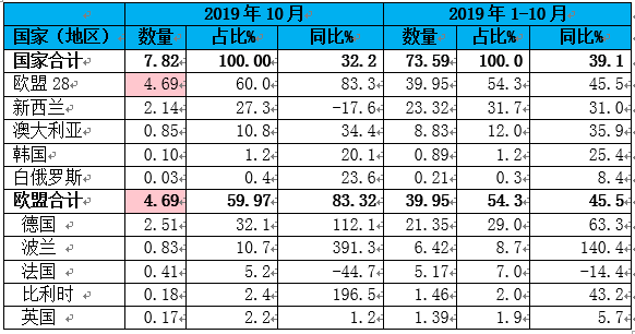 其中,从欧盟进口39.95万吨,占54.3%,同比增加45.5%,从新西兰进口23.32万吨,占31.7%,同比增加31%,从澳大利亚进口8.83万吨,占12%,同比增加35.9%。