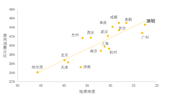 从夜间消费占比来看,深圳的夜间消费占比(44.6%)较高,仅低于成都(45.0%)和贵阳(45.0%),夜间消费占比较高的城市还有长沙(43.4%)、广州(42.8%)、西安(41.7%)等(见图1)。