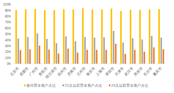 数据说明:夜间营业商户是指18点以后在平台上至少有5单交易的商户,剔除了不到5单交易的商户。营业到22点以后的夜间营业商户是指22点以后在平台上至少有5单交易的商户,剔除了不到5单交易的商户。
