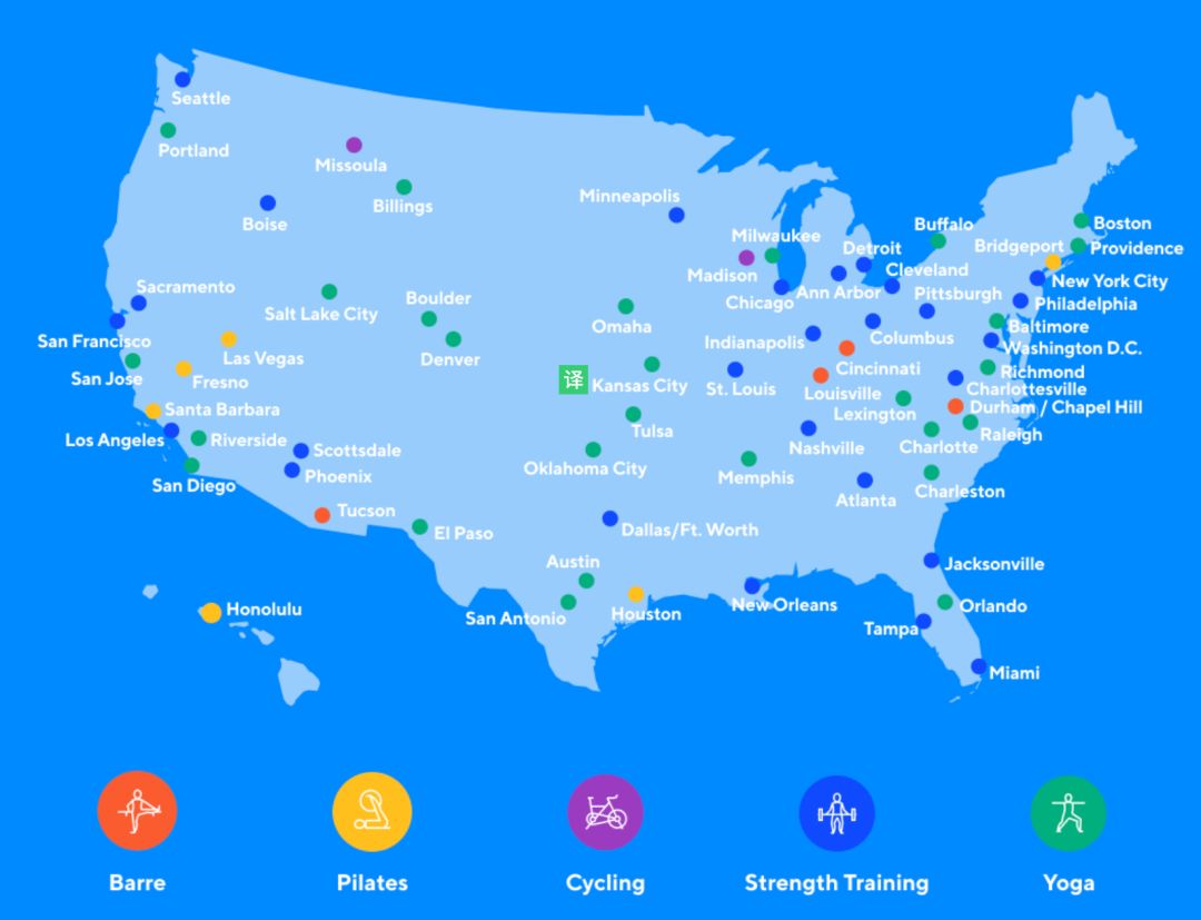 从瑜伽在ClassPass报告的地图分布中能看见,瑜伽更集中于健身产业相对较弱的中部内陆地区,比如堪萨斯城、俄克拉荷马市等等。