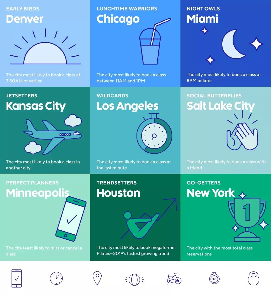 更详细的来看,处于内陆昼日温差极大的丹佛市,课程平均预定时间为上午7:30,芝加哥作为全美主要金融交易中心,健身时间一般为上午11:00-下午1:00,曾被评为最富裕城市的迈阿密,则是晚间8:00。