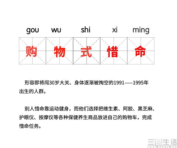 数据显示,90后的健康焦虑更重于80后甚至70后,近年来,90后饱受重度脱发、重度失眠症、逐渐肥胖、记忆力骤减、脾气暴躁等症状困扰。在此基础之下,他们对养生、健康类产品的需求正在逐年增长,客单价和消费频次双双提高,食补、运动和医疗是90后最重要的“惜命”方式,而“购物式惜命”则成为将30岁大关的90后的主流生活方式。