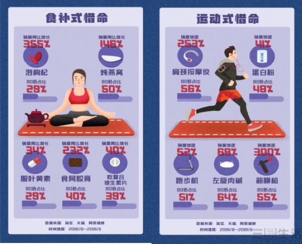 而运动式惜命主要体现在各类健身器材的消费上。根据淘宝方面的数据显示,近三个月,肩颈按摩仪销量增长253%,蛋白粉销量增长41%,跑步机销量增长52%;左旋肉碱销量增长69%;筋膜枪销量增长300%。而购买这些商品的,过半数都是90后。