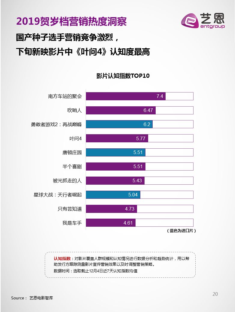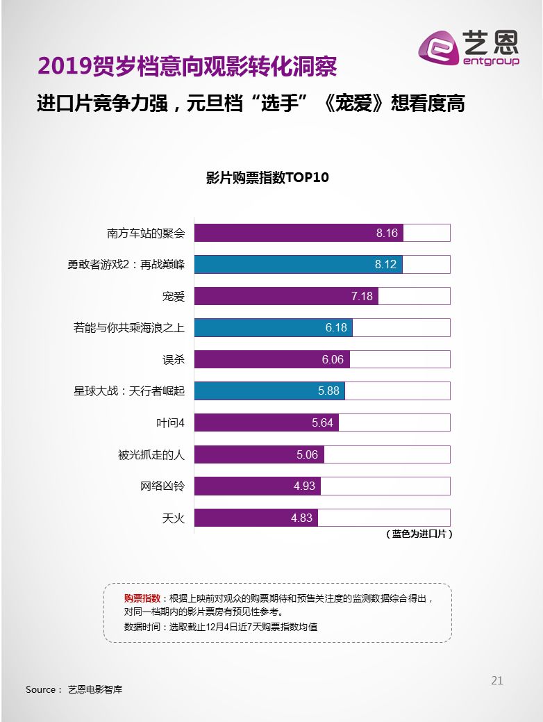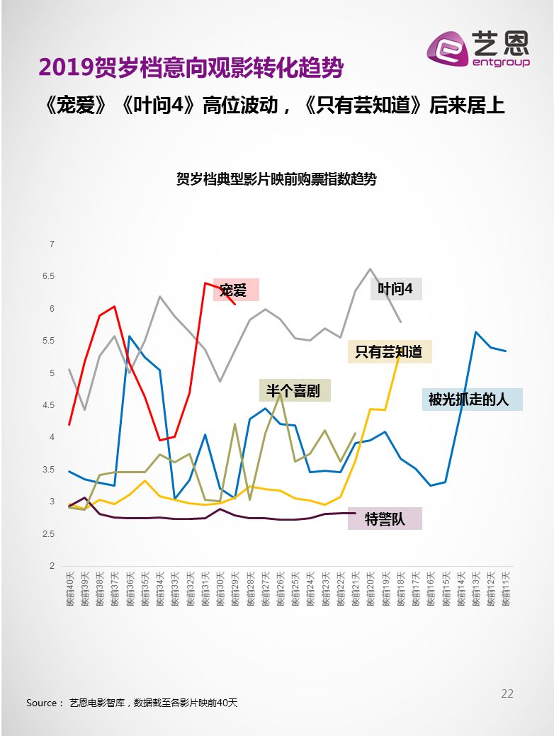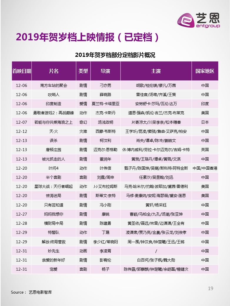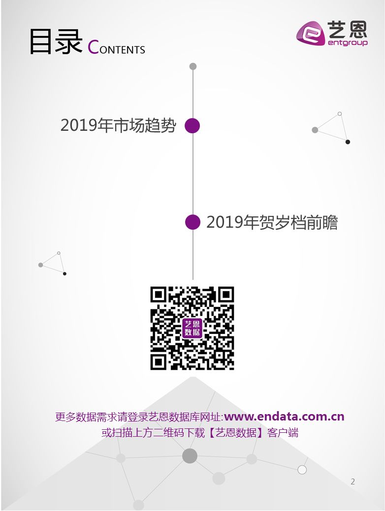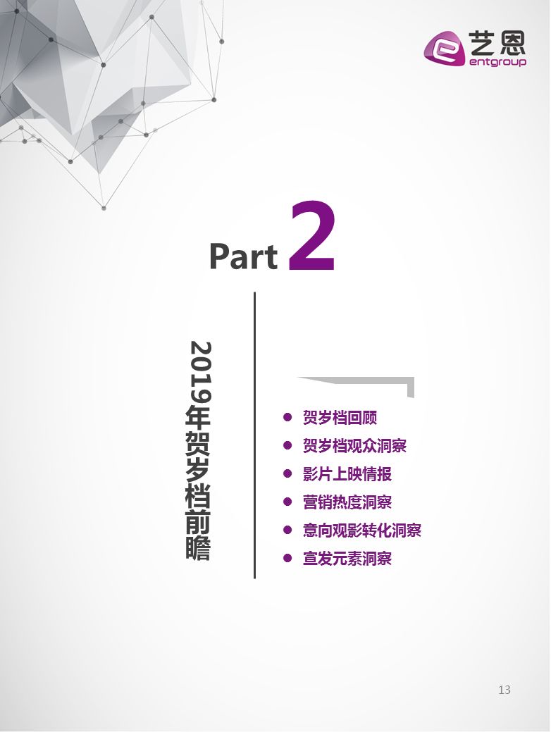 艺恩基于8年沉淀电影票房及营销智库、泛娱乐受众研究等,构建了影市景气监测系统,本次报告在基于2019年市场趋势的初步总结之上,对2019年贺岁档进行前瞻洞察,从历年贺岁档表现回顾、观众洞察,到今年上映情报跟踪、营销热度趋势、意向观影转化洞察、宣发元素洞察等层面进行综合分析,为业内合作伙伴提供参考。