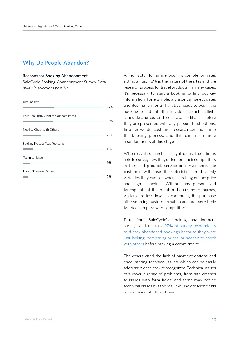 来自Skyscanner等网站的竞争意味着旅客在寻找航班时可能会四处搜索并查看价格。事实上,放弃的主要原因是研究和价格比较。这意味着一定程度的放弃是自然的,但航空公司可以通过为他们提供现场研究的工具,例如使用目的地评论或相关和有用的内容,来尽量减少这种情况。