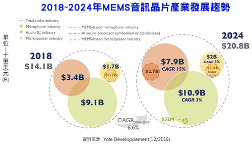 产业研究机构Yole Développement(Yole)发表研究报告指出,麦克风、音频IC和微型扬声器的消费市场预计将从2018年的141亿美元成长到2024年的208亿美元,年复合成长率(CAGR)为6.6%。透过查看MEMS麦克风的数量成长,可以了解所涉及的产品。智能音箱中的MEMS麦克风年复合成长率将达到13%,到2024年产业规模将达到12亿个。在无线耳机中,MEMS麦克风的年复合成长率将达到29%,2024年规模将达到13亿个。