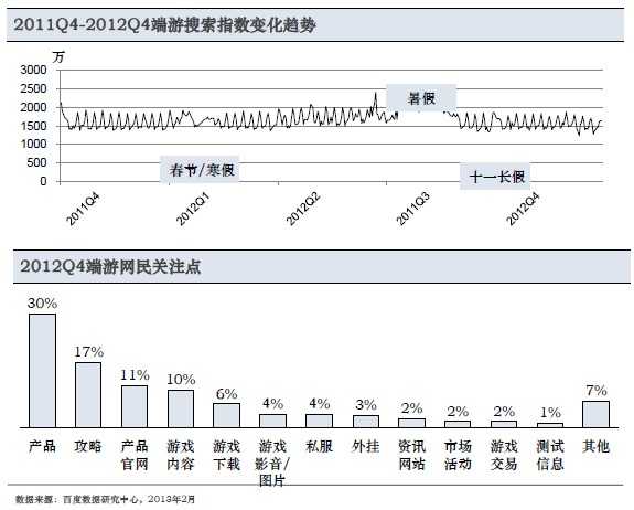 2012年第四季度,端游整体搜索指数首次出现同比下降,降幅为1.2%,环比下降11.9%,大于2011年同期4.4%的降幅。