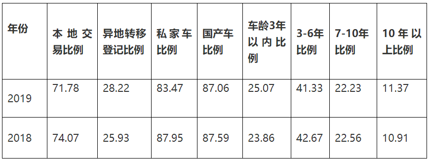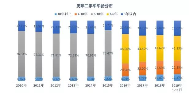 可以看到车龄在6年以内的车型占了总交易量的66.4%。另外,车龄在10年以上的车型比例与去年同期相比小幅增长0.47个百分点。